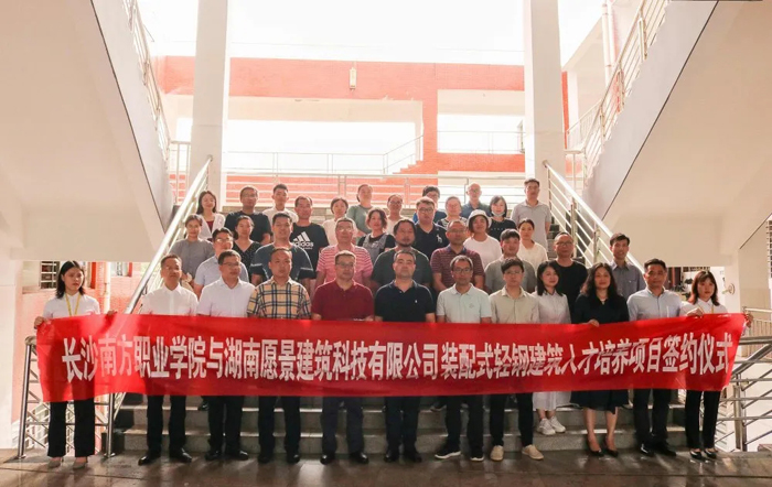 儀式在當天下午突然停電和下大雨的情況下,依然隆重舉行。學院肖曉春院長發(fā)表了熱情洋溢的致辭,他說:此次校企合作最終受益的是我院建筑工程系的學生,對提高他們的專業(yè)技能具有前瞻性,對提高就業(yè)質量和對口就業(yè)率也具有很強的針對性。同時,對我院與愿景建科來說也是一件貫徹黨的十九大和全國高職教育工作會議精神,實現(xiàn)產教融合,合作共贏、共同發(fā)展的大喜事。愿景建科的執(zhí)行董事葛總也發(fā)表了講話,他說:我們企業(yè)目前是湖南省裝配式輕鋼建筑的科研生產基地,裝配式建筑是當今建筑行業(yè)的發(fā)展方向,研究設計、施工技術還處于起步階段,對這方面的人才需求量極大,我們把貴校作為裝配式建筑的人才培養(yǎng)基地,既使貴校在理論、實踐教學上緊跟時代、行業(yè)步伐,又使同學們實現(xiàn)前景廣闊的高質量就業(yè),我們公司以及愿景集團和相關企業(yè)又可以獲得通過我們校企雙方自己培養(yǎng)的高素質的專業(yè)技能對口的人才,實現(xiàn)校企共贏,可謂一舉多得。