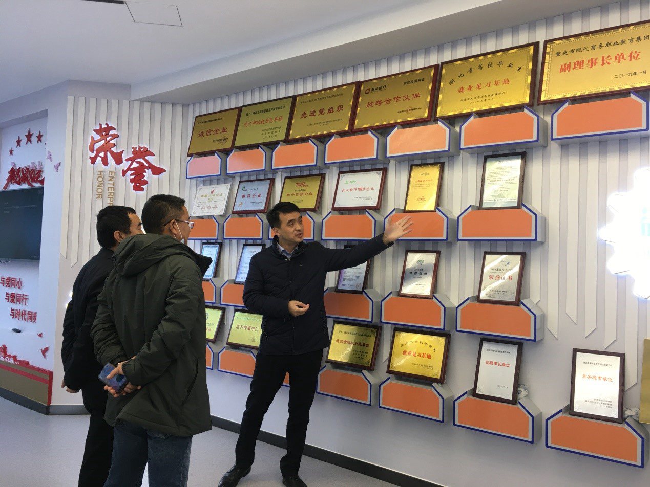 2020年12月4日下午,我院副院長王金以及后勤處長王慶云在美和易思湖南區(qū)域總監(jiān)吳章濤的陪同下赴湖北美和易思教育科技有限公司交流研討。湖北美和易思教育科技有限公司(以下簡稱:美和易思)董事長兼總裁??撕?、黨支部書記兼常務(wù)副總裁郭梁、副總裁張永龍負責(zé)接待。交流研討會在美和易思厚德會議室舉行。