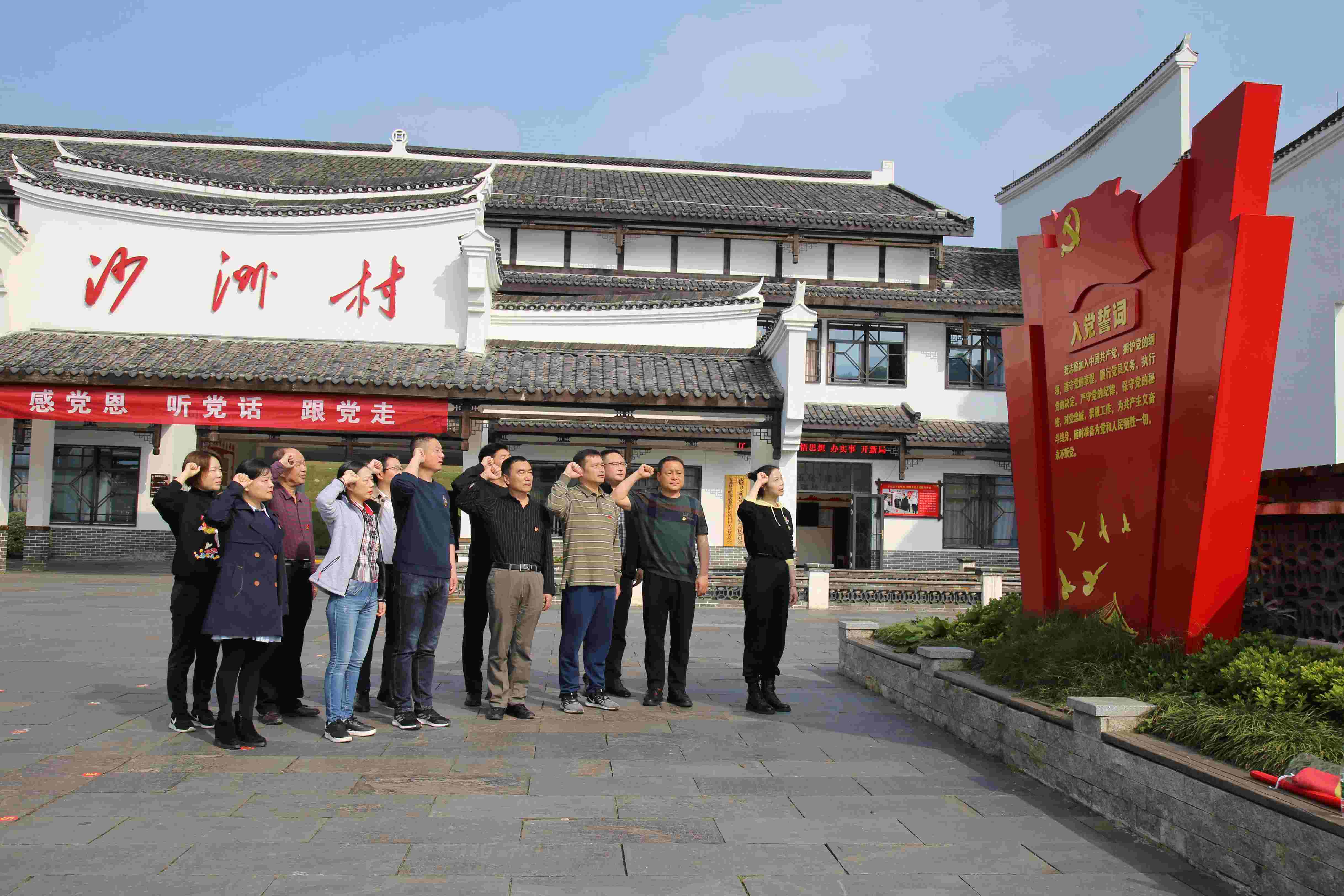 “什么是共產(chǎn)黨?共產(chǎn)黨就是自己有一條被子,也要剪下半條給老百姓的人……”在沙洲村紅色紀(jì)念館中,隨著講解員的講述,一幅幅畫(huà)卷,一件件實(shí)物、一段段視頻,讓大家感受到了當(dāng)年紅軍與百姓風(fēng)雨同舟、血脈相通、生死與共的魚(yú)水情深。在沙洲村廣場(chǎng)入黨誓詞雕塑前,面對(duì)莊嚴(yán)的黨旗,大家懷著崇敬的心情靜默肅立,莊嚴(yán)宣誓,重溫了入黨誓詞。