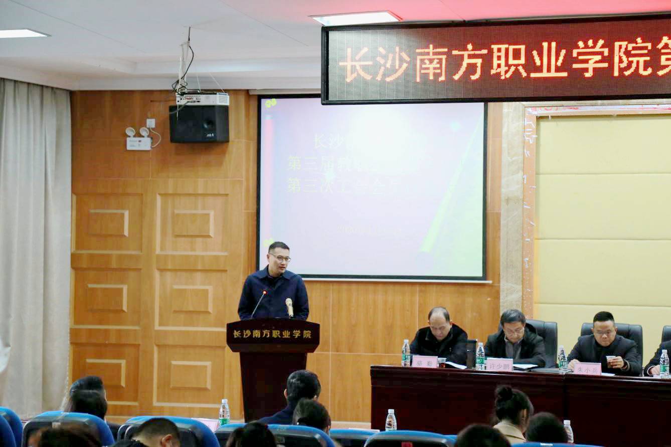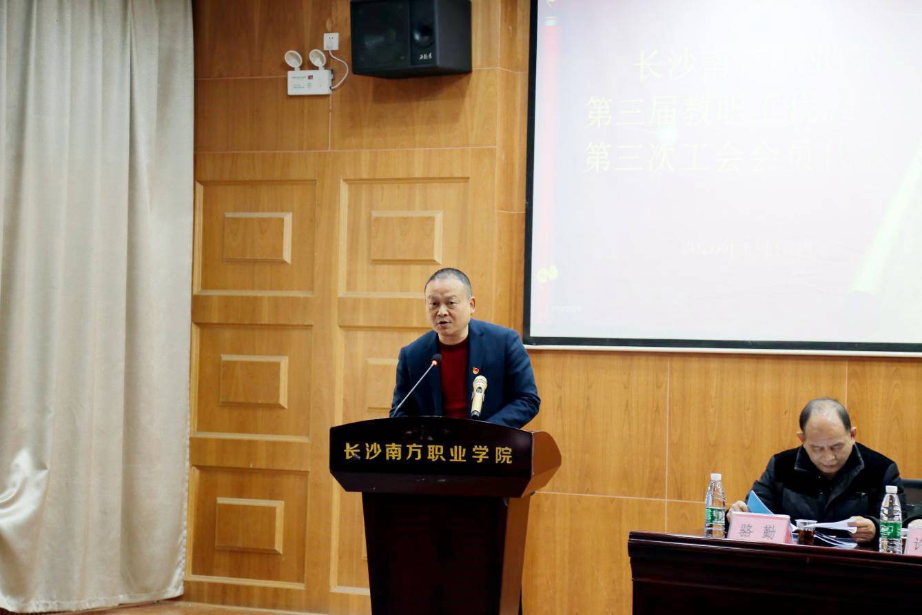 大會(huì)現(xiàn)場(chǎng) 預(yù)備會(huì)上,全體正式代表一致通過(guò)大會(huì)《代表增替補(bǔ)情況說(shuō)明》《代表資格審查報(bào)告》《大會(huì)籌備工作報(bào)告》《大會(huì)主要議程》《主席團(tuán)成員名單及工作職責(zé)》等文件。 正式大會(huì)在莊嚴(yán)的國(guó)歌聲中拉開(kāi)序幕。學(xué)院黨委書(shū)記兼政府督導(dǎo)專員任曉晴致辭,代表院黨委會(huì)向大會(huì)召開(kāi)表示祝賀。就學(xué)院工會(huì)工作提出加強(qiáng)政策學(xué)習(xí),推動(dòng)教代會(huì)工作創(chuàng)新發(fā)展;加強(qiáng)自身建設(shè),提升依法治校和民主管理水平;抓好工作落實(shí),開(kāi)創(chuàng)學(xué)院事業(yè)發(fā)展新局面三點(diǎn)意見(jiàn)。同時(shí)勉勵(lì)大家以此次會(huì)議為新起點(diǎn),堅(jiān)持以習(xí)近平新時(shí)代中國(guó)特色社會(huì)主義思想為指導(dǎo),深入學(xué)習(xí)貫徹黨的十九大和十九屆五中全會(huì)精神, 緊緊圍繞改革思考問(wèn)題、謀劃措施、協(xié)調(diào)關(guān)系、真抓實(shí)干、破解難題,匯聚改革正能量,凝聚發(fā)展新共識(shí),搶抓機(jī)遇,為建設(shè)成特色鮮明的南方職院而努力奮斗! 黨委書(shū)記兼政府督導(dǎo)專員任曉晴同志致開(kāi)幕辭 學(xué)院院長(zhǎng)肖曉春、工會(huì)主席肖建偉、財(cái)務(wù)總監(jiān)伍珊分別作學(xué)院2020年《工作報(bào)告》《工會(huì)工作報(bào)告》《財(cái)務(wù)工作報(bào)告》;工會(huì)委員劉中良代表大會(huì)主席團(tuán)報(bào)告《征集提案情況說(shuō)明》。 學(xué)院院長(zhǎng)肖曉春作年度工作報(bào)告 學(xué)院工會(huì)肖建偉主席作年度工會(huì)工作報(bào)告 財(cái)務(wù)總監(jiān)伍珊作年度財(cái)務(wù)工作報(bào)告 工會(huì)委員劉中良報(bào)告《征集提案情況說(shuō)明》 學(xué)院工會(huì)副主席王建輝致閉幕辭,代表大會(huì)主席團(tuán)對(duì)大會(huì)的圓滿召開(kāi)表示祝賀,對(duì)代表們?yōu)閷W(xué)院事業(yè)發(fā)展積極建言獻(xiàn)策的高度責(zé)任心與主人翁意識(shí)表示感謝,同時(shí)建議各與會(huì)代表、各單位會(huì)后認(rèn)真學(xué)習(xí)、落實(shí)大會(huì)報(bào)告內(nèi)容及領(lǐng)導(dǎo)講話精神,始終不忘教書(shū)育人初心、牢記立德樹(shù)人使命,為推進(jìn)學(xué)院事業(yè)科學(xué)發(fā)展、為建設(shè)成為一流高職院校而不懈努力。 參會(huì)人員合影 本次會(huì)議既是深化和鞏固“不忘初心、牢記使命”主題教育成果的一次盛會(huì),也是加快學(xué)院轉(zhuǎn)型發(fā)展的一次盛會(huì)。將進(jìn)一步振奮全院教職工工作熱情,增強(qiáng)拼搏實(shí)干、加快發(fā)展的工作意識(shí);統(tǒng)一全院教職工思想認(rèn)識(shí),提升自身整體素質(zhì),成為學(xué)院搶抓發(fā)展機(jī)遇、實(shí)現(xiàn)轉(zhuǎn)型發(fā)展、鑄就新輝煌的新起點(diǎn)。