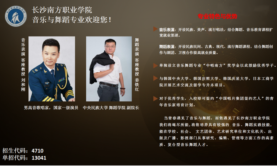 長(zhǎng)沙南方職業(yè)學(xué)院與中國(guó)唱片集團(tuán)有限公司共同簽署音樂舞蹈專業(yè)合作辦學(xué)協(xié)議,正式成立“中唱數(shù)字文化藝術(shù)學(xué)院”,將共同培養(yǎng)具備音樂、舞蹈實(shí)踐技能,能在藝術(shù)教學(xué)、電視廣播、藝人、社會(huì)文藝團(tuán)體及文化機(jī)關(guān)、出版機(jī)構(gòu)、影視機(jī)構(gòu)等從事各方面工作的高素質(zhì)、復(fù)合型前沿音樂與舞蹈人才,并于2021年開始招生。