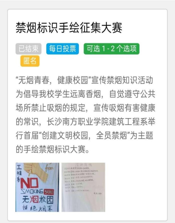 為更好地配合5月31日世界無煙日的宣傳, 建筑工程系開展以“無煙校園,師生在行動(dòng)”為主題的禁煙標(biāo)識(shí)手繪征集活動(dòng)。旨在使大家充分認(rèn)識(shí)到吸煙的危害,遠(yuǎn)離香煙,共建文明校園。