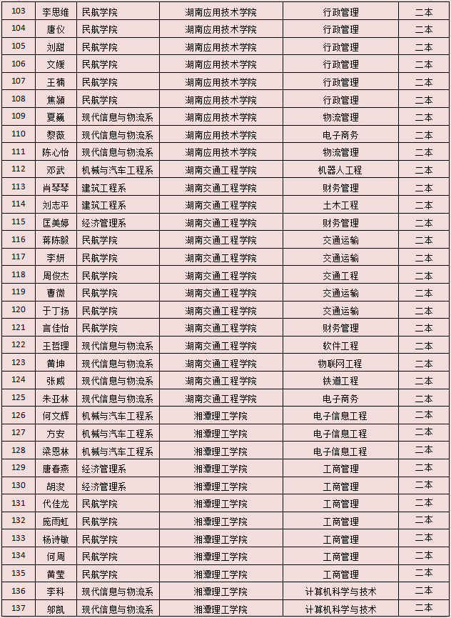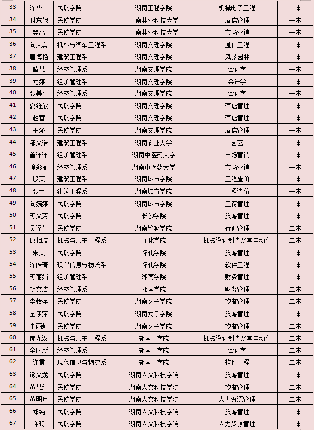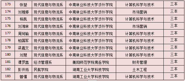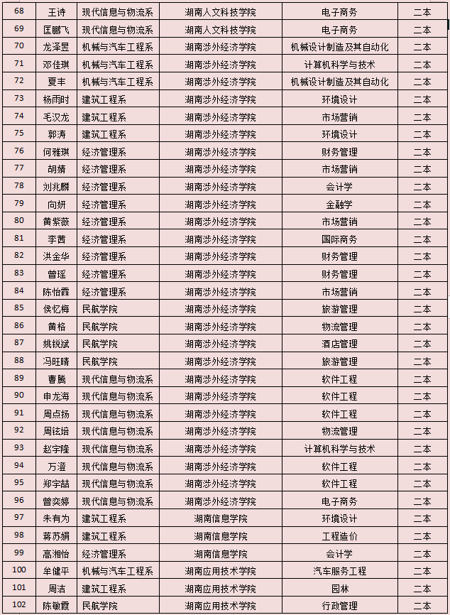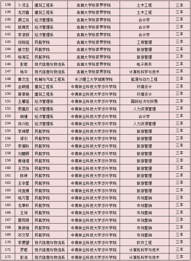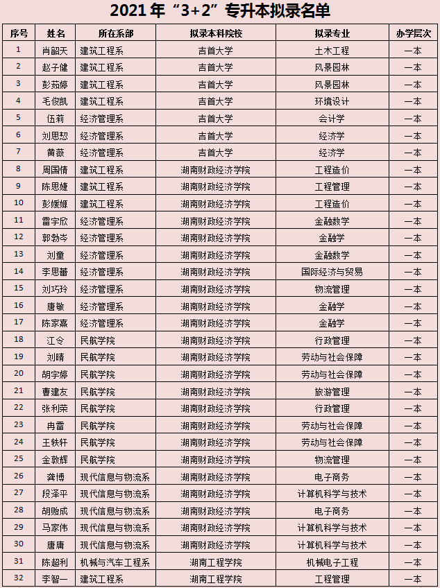 2021年湖南省專升本擬錄名單已全部公示,我院2021年“3+2”專升本實(shí)際參考420 人(含免試推薦9人),本科院校擬錄183人,擬錄率43.6%。其中一本擬錄50人、二本擬錄87人、三本擬錄46人?,F(xiàn)將擬錄名單公告如下: