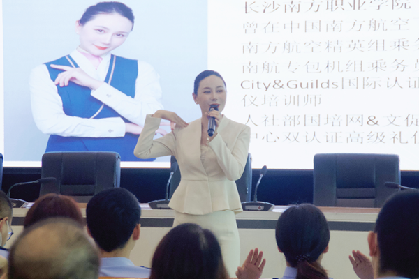 近日,為立足高校服務社會職能,促進高校教育資源輻射社會,結(jié)合湖南省空中乘務專業(yè)教學團隊自身學科與師資優(yōu)勢,民航學院空中乘務專業(yè)師生為湖南省長沙監(jiān)獄警務人員進行了警察公務禮儀培訓。此次培訓由孫林芳老師主講,由空中乘務專業(yè)曾慧穎、陳湘香、楊瑩三名學生進行輔助示范展示。