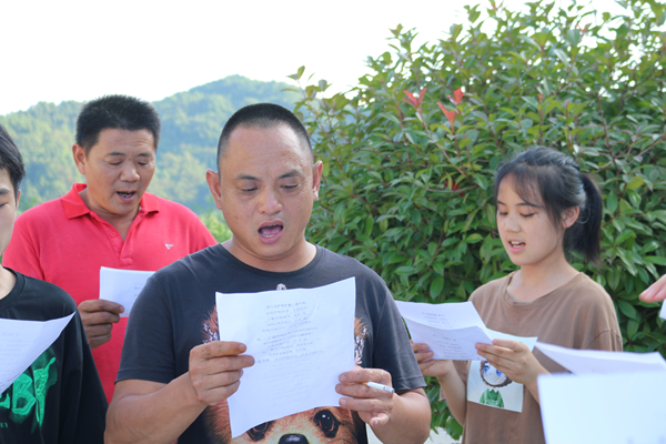 脫貧攻堅(jiān)戰(zhàn)的勝利,得益于黨和國(guó)家的方針政策科學(xué)有效,更離不開一代代尤溪村民堅(jiān)守不棄。依據(jù)“播撒藝術(shù)的種子”的活動(dòng)主題,志愿團(tuán)隊(duì)撰寫了《振興中的尤溪村》,并組織村民及留守兒童編排成配樂詩朗誦,用以傳誦感恩黨和國(guó)家的政策,對(duì)外宣傳振興中的尤溪村。