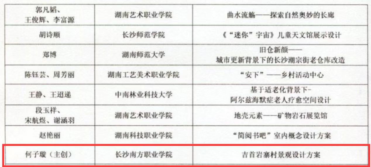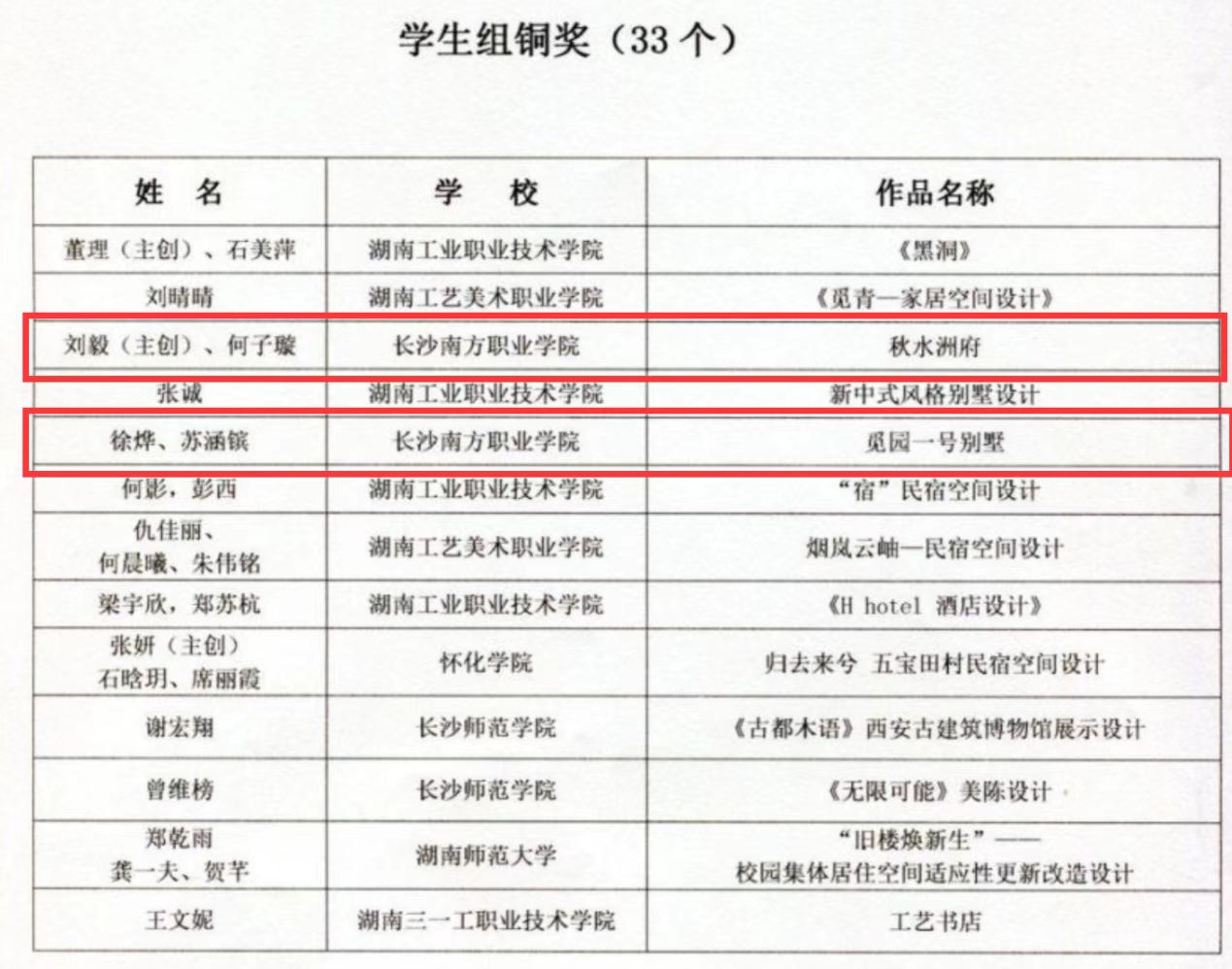 11月23日獲悉,湖南省室內(nèi)裝飾協(xié)會舉辦了2022年湖南省室內(nèi)裝飾設(shè)計雙年展中,長沙南方職業(yè)學(xué)院由建筑工程系主任項林副教授任組長,何舒燕、周家峰、曾文妮、謝恩隆、陳燦、周妮、屈鑫海等7位老師帶領(lǐng)的6名學(xué)生組成了4支隊伍參加了此次比賽。在一本、二本、高職院校同臺競技巔峰對決中,取得了一銀三銅的好成績,獲獎率100%,成為本次雙年展備受矚目的優(yōu)勝院校。
