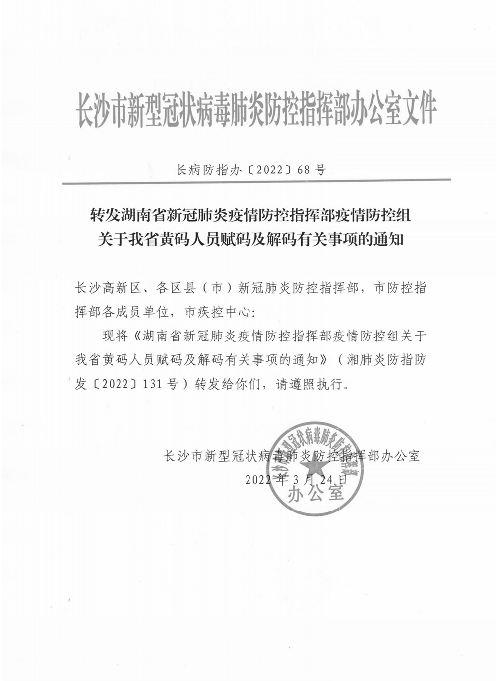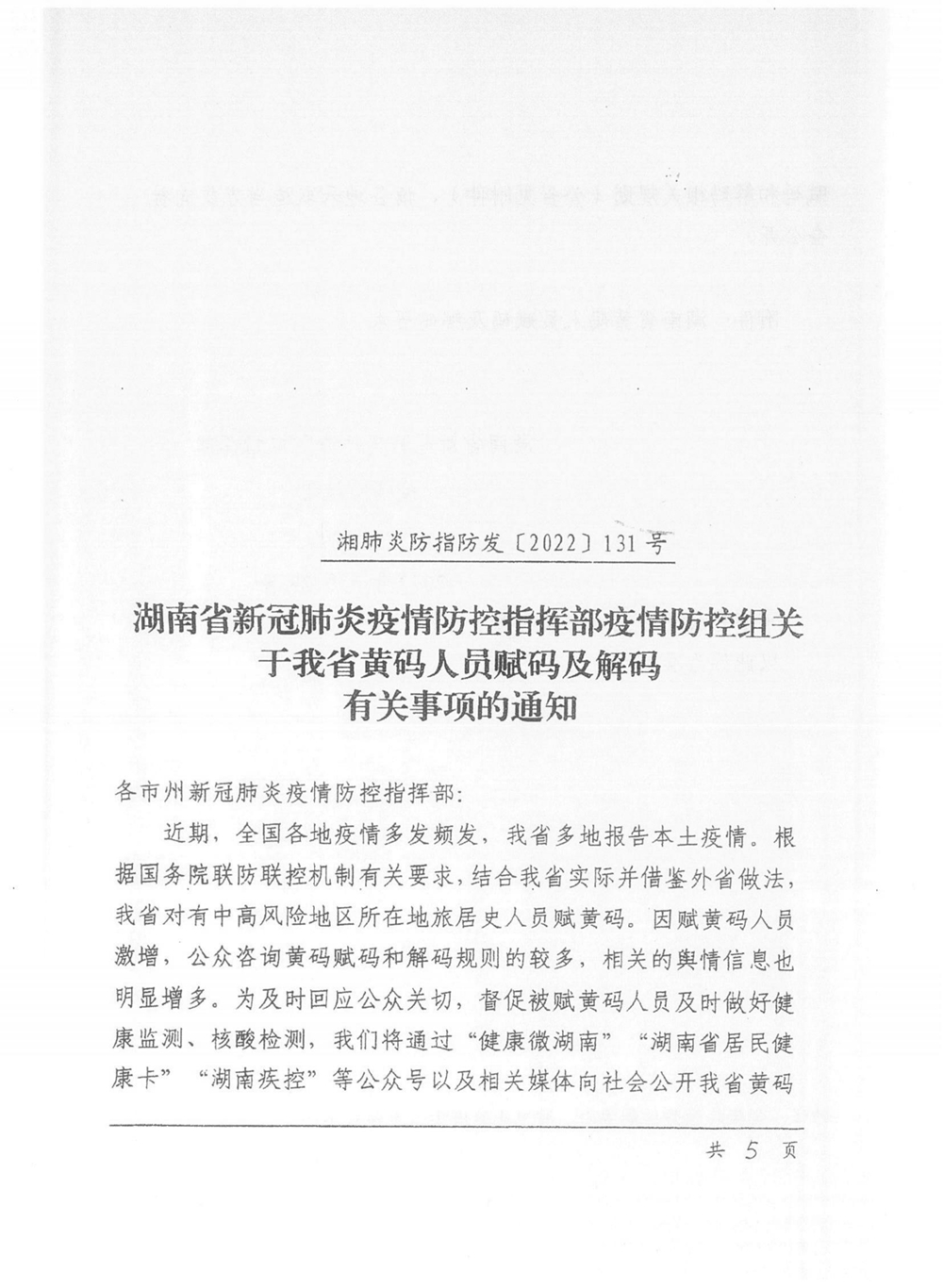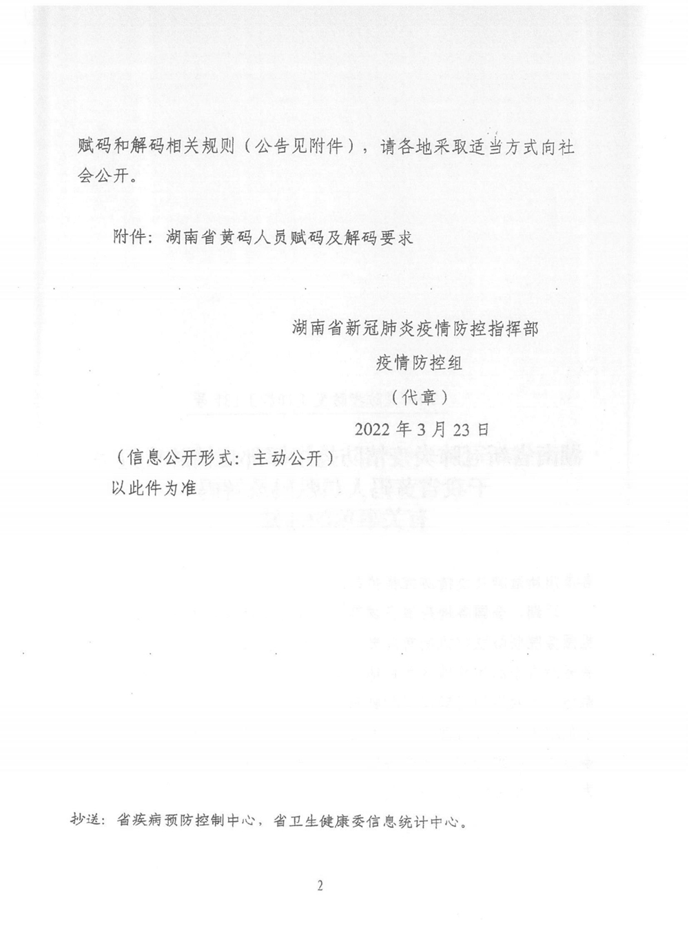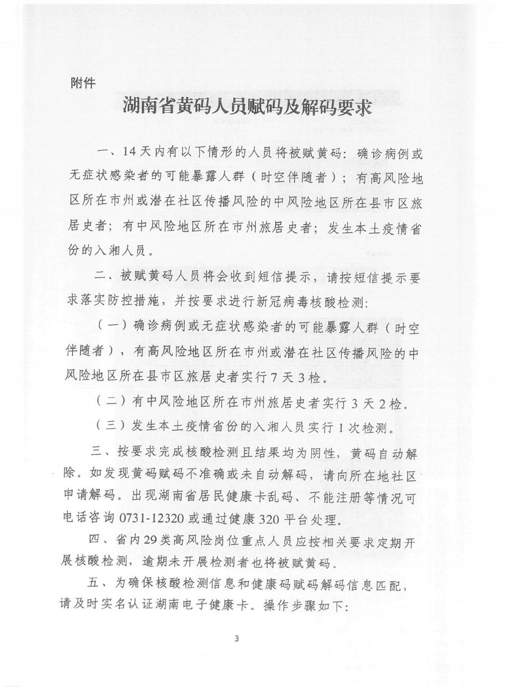 湖南省新冠肺炎疫情防控指揮部疫情防控組關于我省黃碼人員賦碼及解碼有關事項的通知