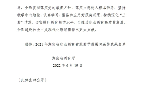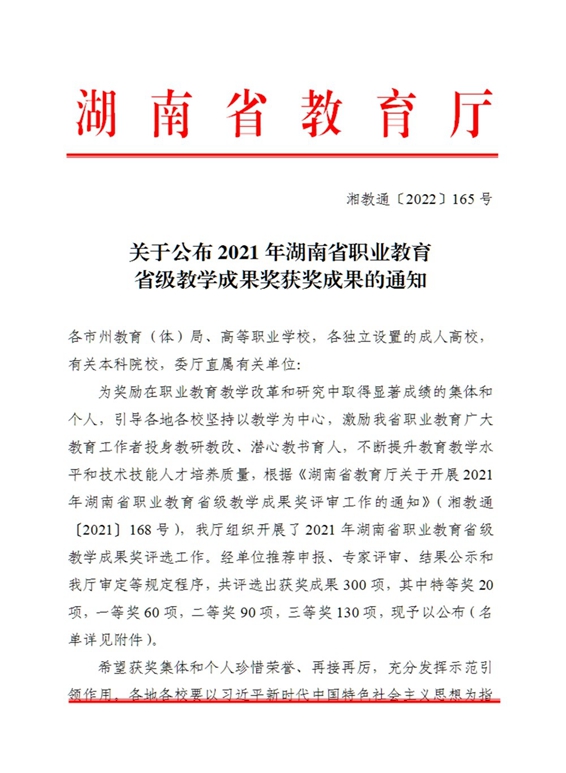 根據(jù)省教育廳發(fā)布的通知顯示,2021年湖南省職業(yè)教育省級教學成果獎,共評選出獲獎成果300 項(含中高職),其中特等獎20項,一等獎60 項,二等獎90 項,三等獎130 項。我院此次推薦申報的3個項目全部獲獎,獲獎數(shù)量創(chuàng)歷史新高。這是學院多年來始終堅持教學改革、教師們潛心耕耘所取得的喜人碩果,未來希望各項目團隊再接再厲,爭取再創(chuàng)佳績。