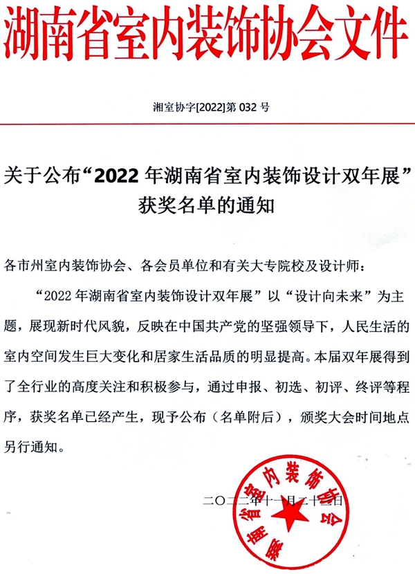 為更好地反映在黨的堅強領(lǐng)導(dǎo)下,人民生活的室內(nèi)空間發(fā)生的巨大變化和居家生活品質(zhì)的明顯提高,以崇尚人文設(shè)計,綠色設(shè)計,展現(xiàn)時代新風(fēng)貌,弘揚湖湘設(shè)計精神。湖南省室內(nèi)裝飾協(xié)會組織舉辦了“設(shè)計向未來”暨2022年湖南省室內(nèi)裝飾設(shè)計雙年展,大賽共收到專業(yè)組和學(xué)生組作品620幅,565幅作品(其中專業(yè)組390幅、學(xué)生組175幅)初審入圍。經(jīng)大賽組委會專家評委綜合評審,學(xué)生組評選出金獎13個、銀獎21個、銅獎33個,我校4支參賽隊全部獲獎。