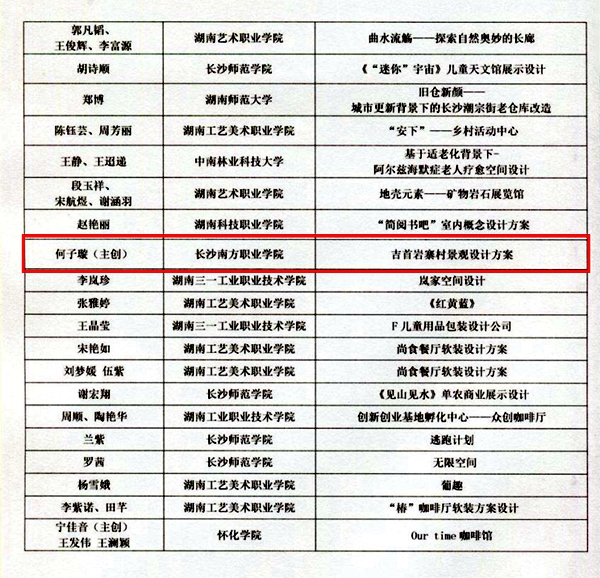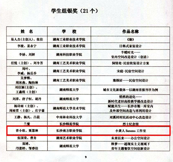 11月23日,據(jù)湖南省室內(nèi)裝飾協(xié)會官網(wǎng)《關(guān)于公布“2022年湖南省室內(nèi)裝飾設(shè)計雙年展”獲獎名單的通知》顯示,我校建筑室內(nèi)設(shè)計專業(yè)曾小歐等6名學(xué)生組成的4支參賽隊在全省本科、高職院校作品同臺對決中,摘得1銀3銅,成為本次雙年展備受矚目的優(yōu)勝院校。