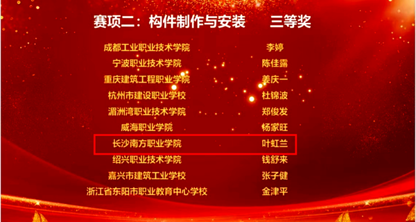 據(jù)悉,該賽事由中華人民共和國(guó)住房和城鄉(xiāng)建設(shè)部人事司指導(dǎo),中國(guó)建設(shè)教育協(xié)會(huì)主辦。此前在11月舉辦的湖南省第五屆裝配式建筑職業(yè)技能大賽上,我校建筑工程系學(xué)生張錄云、葉虹蘭獲得裝配式構(gòu)件制作與安裝賽項(xiàng)三等獎(jiǎng),成功入圍國(guó)賽。