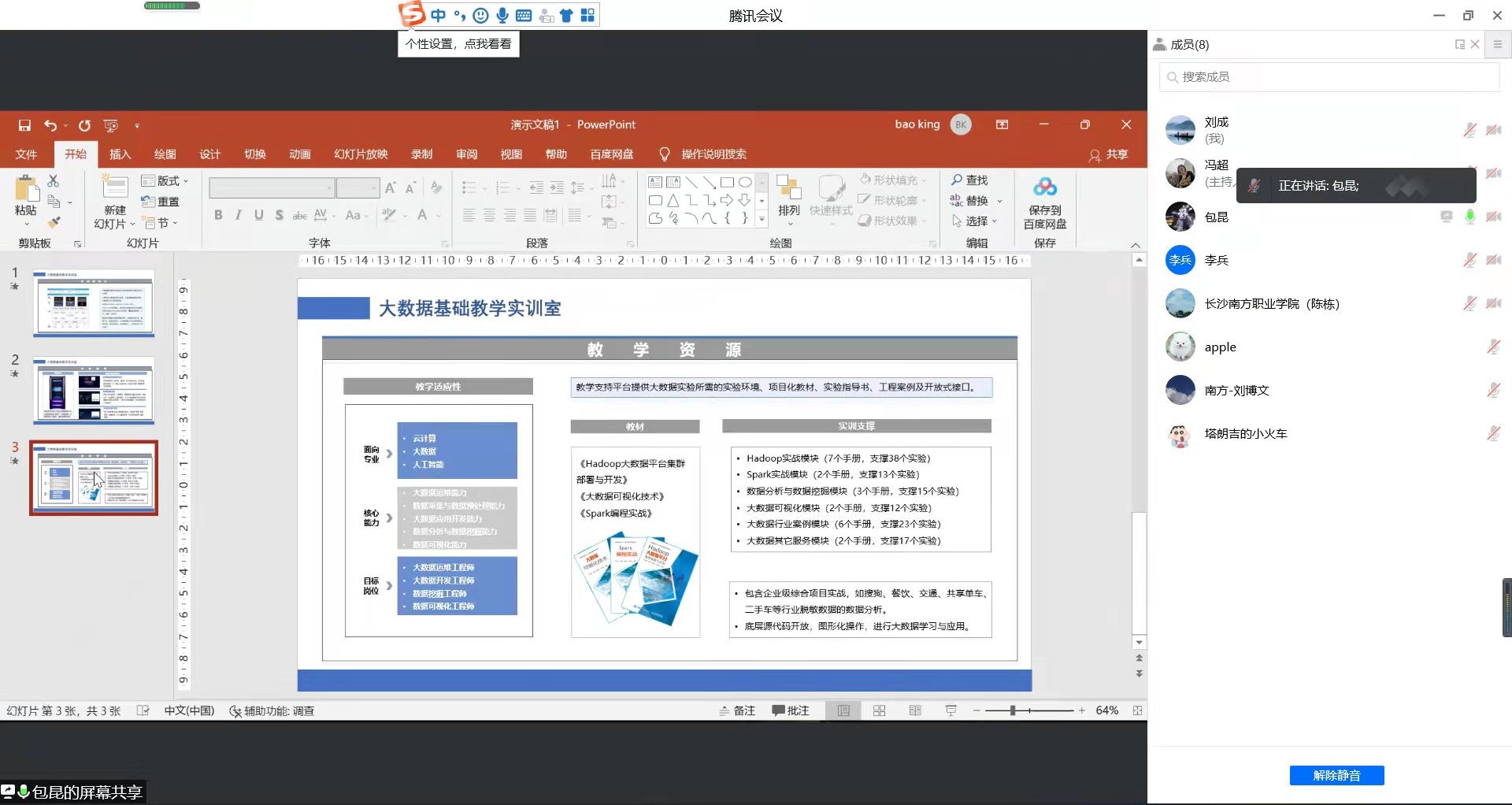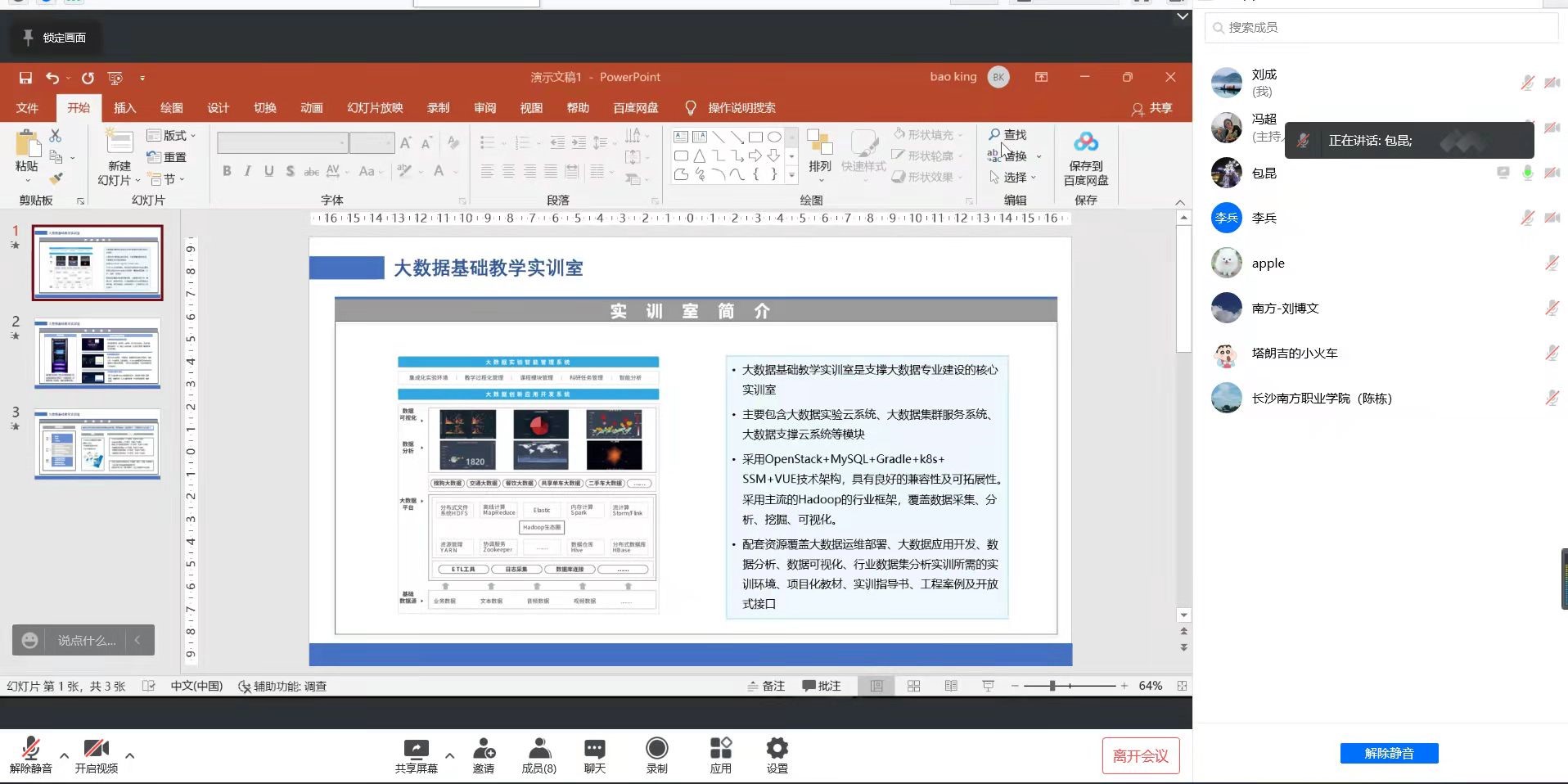 會(huì)上,馮經(jīng)理介紹了華晟經(jīng)世公司的基本情況,著重講述了公司在大數(shù)據(jù)技術(shù)專(zhuān)業(yè)校企合作方面的經(jīng)驗(yàn)和成績(jī);包經(jīng)理主要介紹了大數(shù)據(jù)專(zhuān)業(yè)的實(shí)訓(xùn)室建設(shè)及貴公司開(kāi)發(fā)的大數(shù)據(jù)實(shí)訓(xùn)系統(tǒng)平臺(tái)。大數(shù)據(jù)專(zhuān)業(yè)負(fù)責(zé)人陳棟老師介紹了大數(shù)據(jù)技術(shù)專(zhuān)業(yè)的發(fā)展現(xiàn)狀以及現(xiàn)階段人才培養(yǎng)的問(wèn)題。雙方就基于疫情下的線(xiàn)上教學(xué)、教學(xué)資源開(kāi)發(fā)、實(shí)訓(xùn)室平臺(tái)的建設(shè)、專(zhuān)業(yè)的人才需求趨勢(shì)及崗位分析、專(zhuān)業(yè)課程體系的構(gòu)建,校企合作共育的前景進(jìn)行了充分的交流探討。