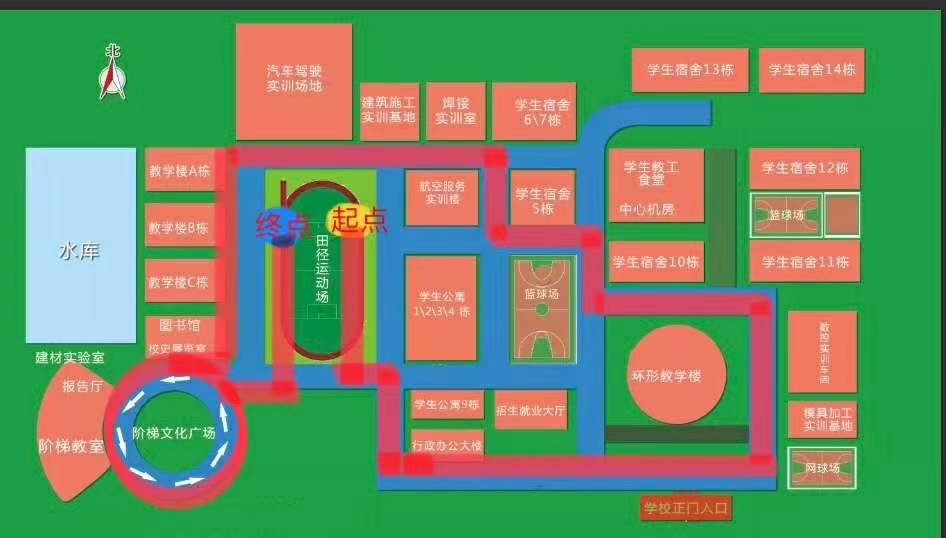 田徑場(chǎng)主席臺(tái)對(duì)面的彩色階梯—9棟—行政辦公大樓—校門口—垃圾場(chǎng)—數(shù)控實(shí)訓(xùn)車間—10棟宿舍南側(cè)上坡—風(fēng)雨棚籃球場(chǎng)東側(cè)—風(fēng)雨棚籃球場(chǎng)北側(cè)—二食堂東側(cè)【從5棟這邊過(guò)】—旱接實(shí)訓(xùn)室—駕校—ABCD棟—階梯文化廣場(chǎng)環(huán)繞一圈—田徑場(chǎng)主席臺(tái)。
