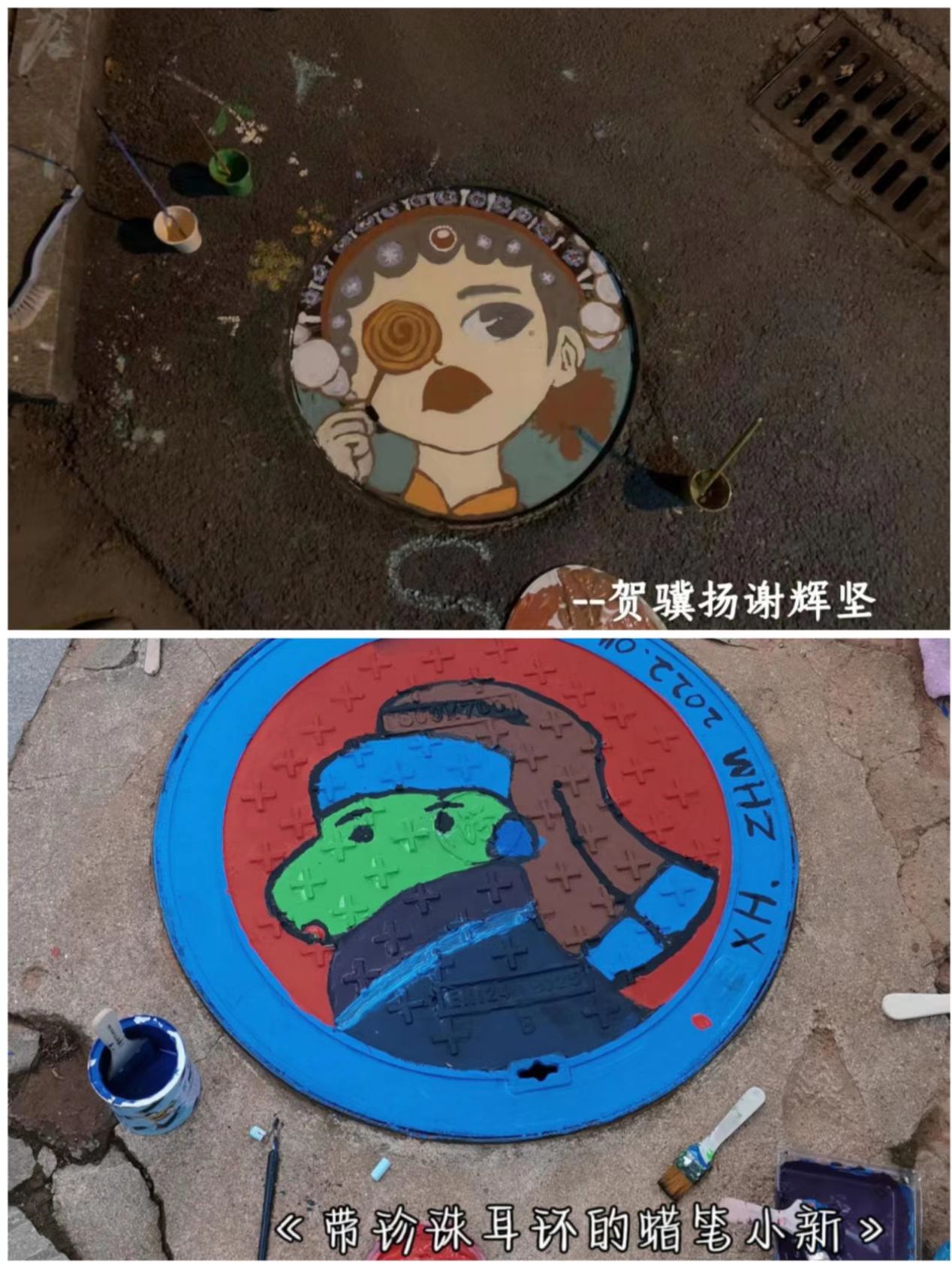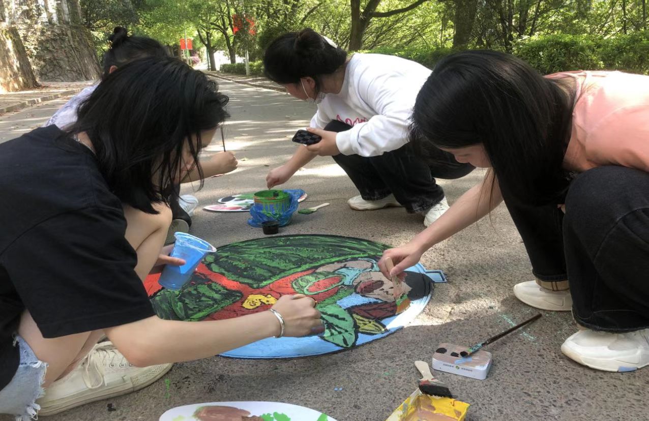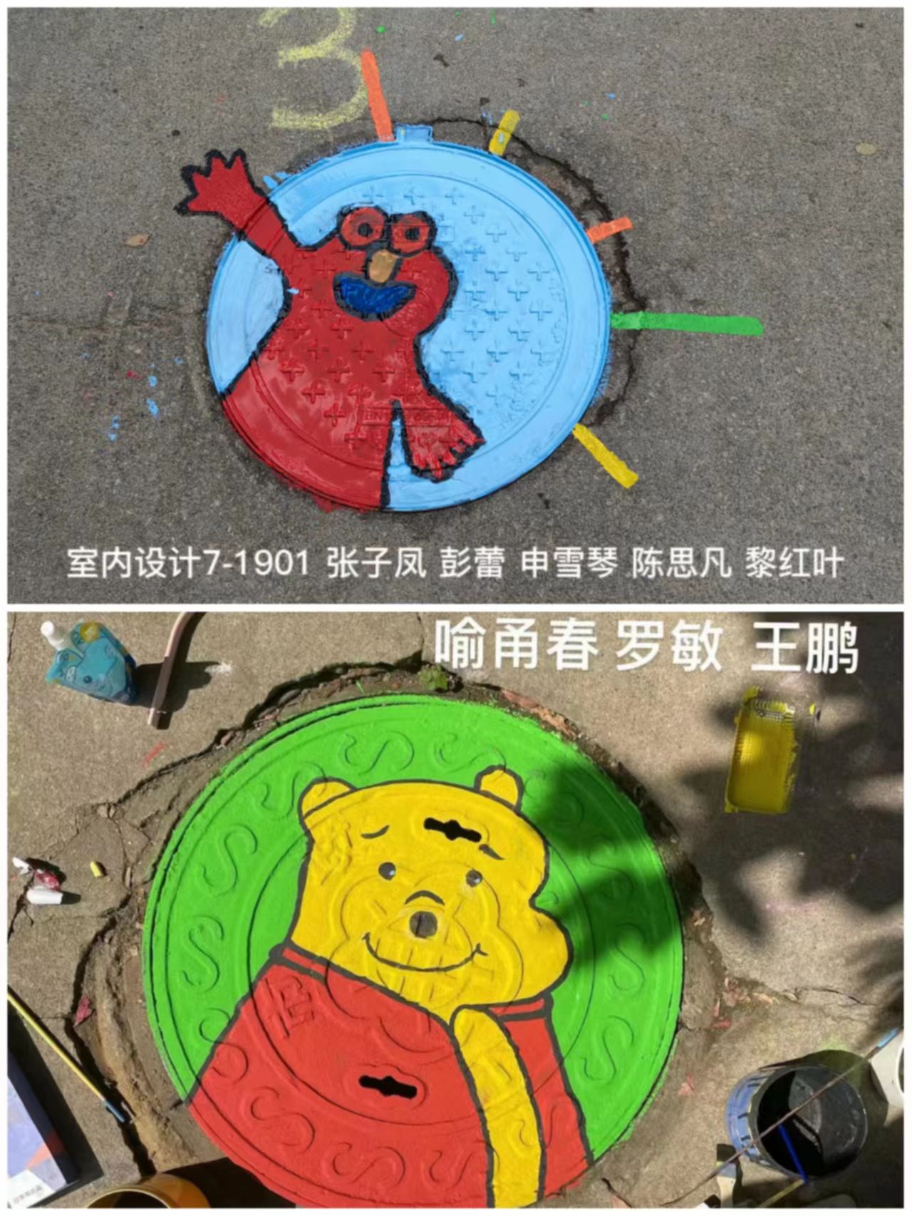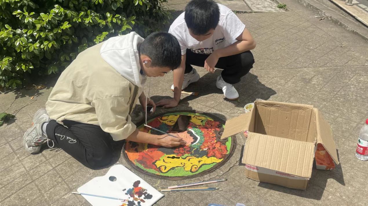 志愿者學生正在進行井蓋彩繪活動之一