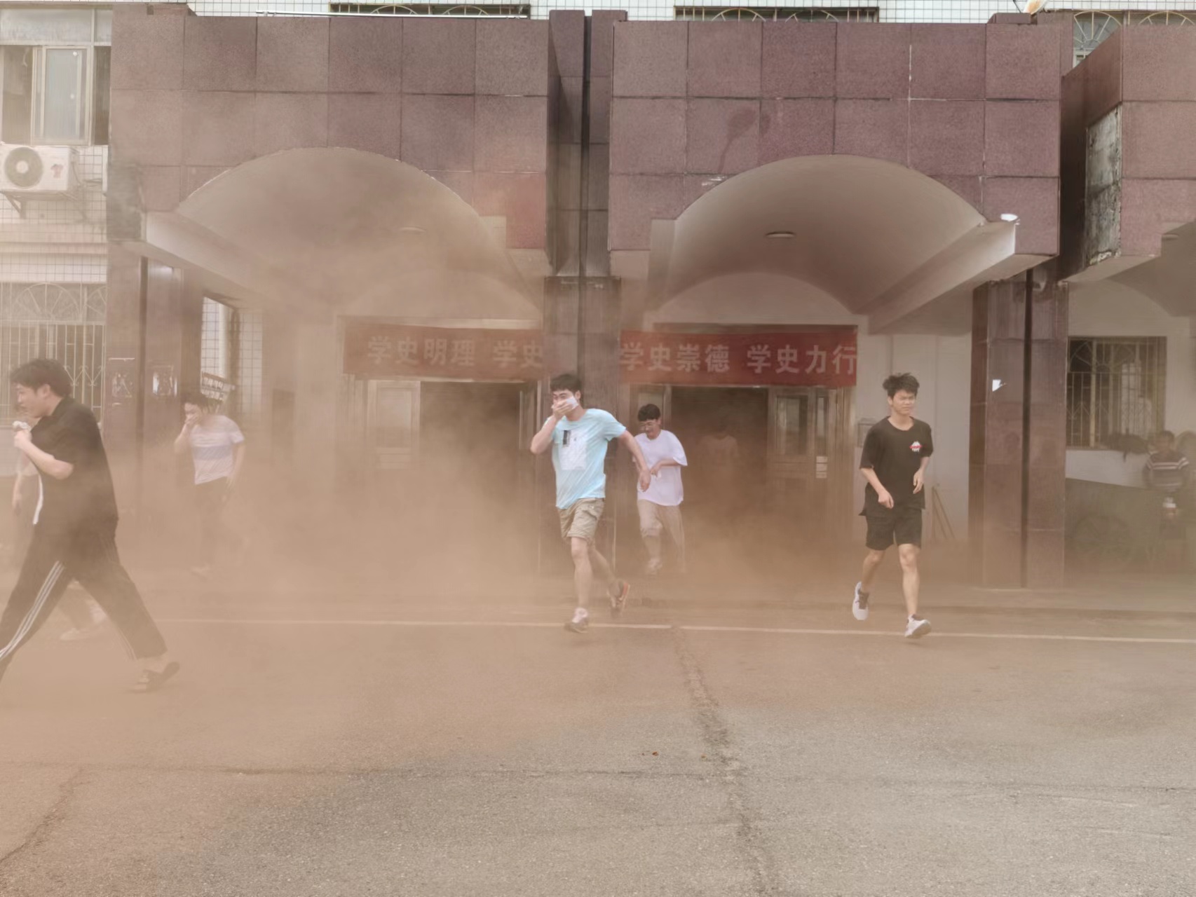 隨著煙霧彈的燃放,宿舍響起了警報(bào)聲,演練正式開(kāi)始。警報(bào)拉響后,演練按照既定方案執(zhí)行,學(xué)生們用毛巾遮護(hù)口鼻、彎腰低姿前行,相應(yīng)樓層志愿者分站在疏散通道各個(gè)拐角、樓梯出口處,整個(gè)過(guò)程有條不紊的進(jìn)行,疏散快速有序。4分鐘之內(nèi),全體同學(xué)全部到達(dá)操場(chǎng),并由班長(zhǎng)清查人數(shù)。