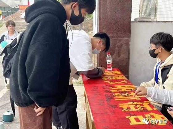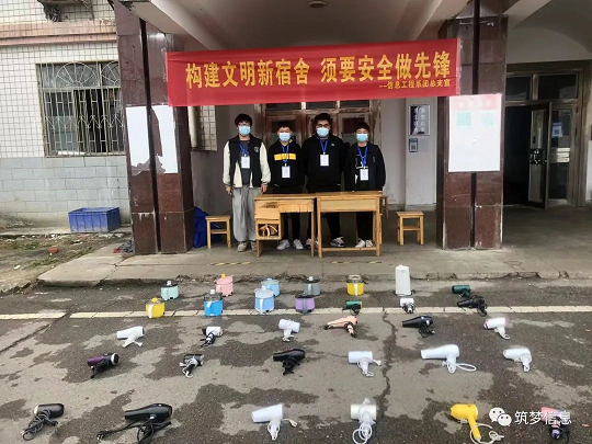 信息工程系團(tuán)學(xué)會成員們在五棟宿舍樓將查寢繳獲的違規(guī)電器進(jìn)行展示,擺放整齊,把橫幅擺放好,路過的同學(xué)們紛紛在橫幅上簽字留念,表達(dá)對本次活動的支持。