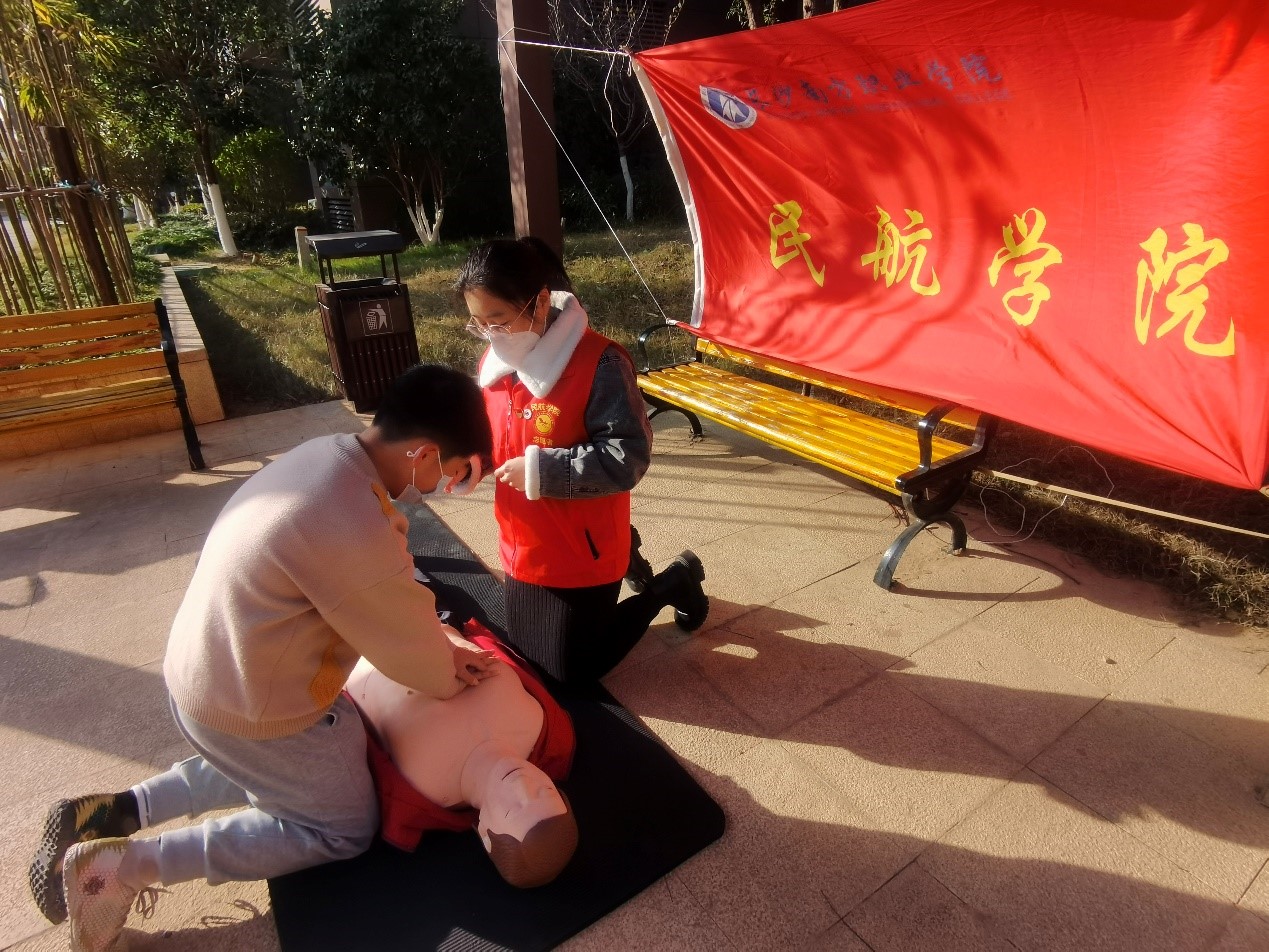 空中乘務專業(yè)、民航運輸服務專業(yè)、民航安全技術(shù)管理專業(yè)部分同學線上同步參與活動,為居民們準備了宣傳資料,拍攝了多條急救操作的視頻資源,并為居民做了線上指導?;顒蝇F(xiàn)場,專業(yè)群教師們對氣道異物梗阻、胸外按壓(CPR)技能、包扎等常見問題處理進行了現(xiàn)場講授,大家都踴躍參與其中。