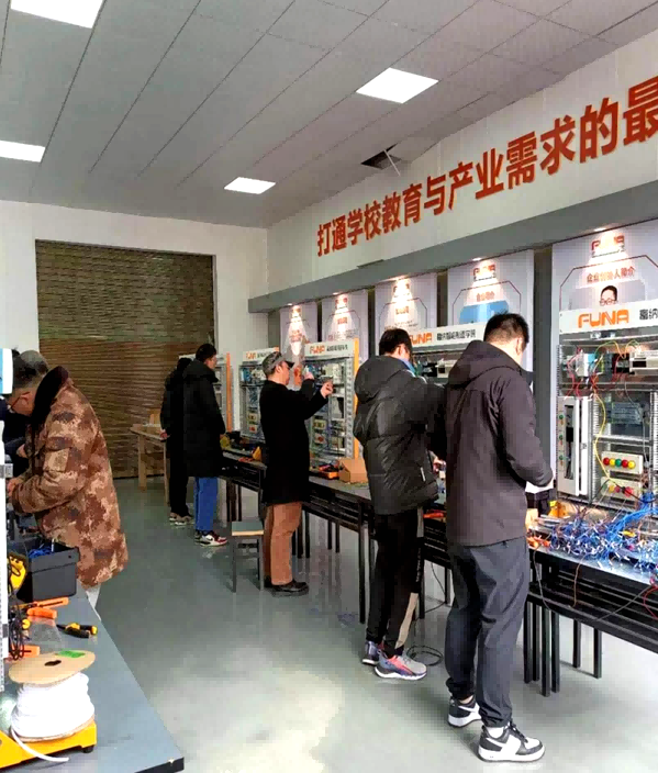 為強(qiáng)化教師專(zhuān)業(yè)技能,建設(shè)既具備“相應(yīng)理論和實(shí)踐教學(xué)能力”,又具有“企業(yè)相關(guān)工作經(jīng)歷,或積極深入企業(yè)和生產(chǎn)服務(wù)一線(xiàn)崗位實(shí)踐,能夠及時(shí)將新技術(shù)、新工藝、新規(guī)范融入教學(xué)”的“雙師型”師資團(tuán)隊(duì),培養(yǎng)高素質(zhì)技術(shù)技能人才。2023年寒假,機(jī)電工程系開(kāi)展了為期3天的教師專(zhuān)業(yè)技能培訓(xùn)。培訓(xùn)由學(xué)校和富納企業(yè)合作開(kāi)展,培訓(xùn)涵蓋職業(yè)素養(yǎng)、職業(yè)精神在內(nèi)的“機(jī)械裝調(diào)”“電氣裝調(diào)”等項(xiàng)目,培訓(xùn)師由富納企業(yè)選派,培訓(xùn)地點(diǎn)在“富納智能制造產(chǎn)業(yè)學(xué)院”等實(shí)訓(xùn)室,培訓(xùn)考核由企業(yè)和學(xué)校聯(lián)合進(jìn)行。參訓(xùn)教師態(tài)度虛心、操作認(rèn)真,評(píng)價(jià)結(jié)果校企雙方滿(mǎn)意,實(shí)現(xiàn)“雙贏”。