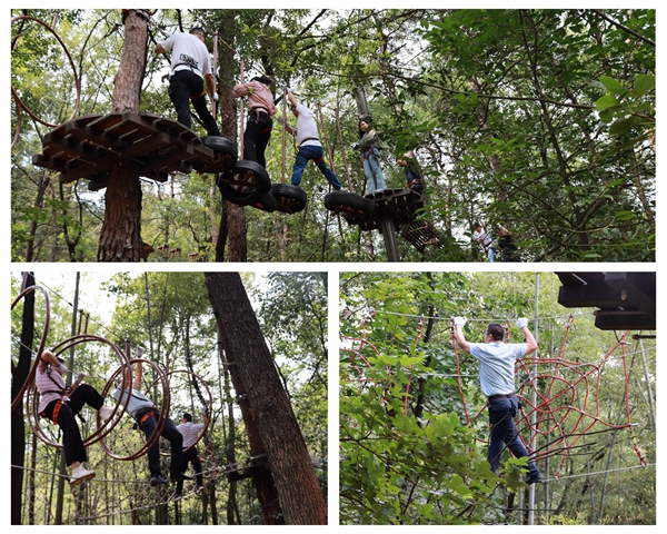 叢林穿越游戲環(huán)節(jié),通過(guò)在高空穿越各種難易不同的關(guān)卡,大家體驗(yàn)了穿越隧道、叢林索道、空中飛人、樹(shù)筒平衡等不同程度的刺激,在挑戰(zhàn)中戰(zhàn)勝了恐懼。