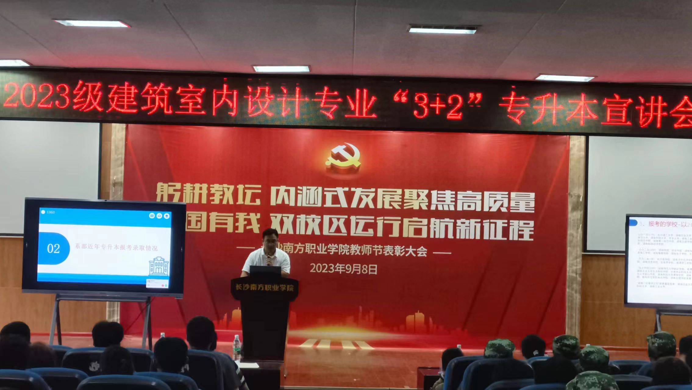 為進(jìn)一步促進(jìn)新生對(duì)專升本政策的了解,幫助新生做好在校期間的學(xué)業(yè)規(guī)劃,強(qiáng)化學(xué)風(fēng)建設(shè),2023年9月15日,長沙南方職業(yè)學(xué)院建筑工程系在學(xué)術(shù)報(bào)告廳組織了2023級(jí)建筑室內(nèi)設(shè)計(jì)專業(yè)(以下簡(jiǎn)稱“室內(nèi)設(shè)計(jì)”)“3+2”專升本宣講會(huì)。