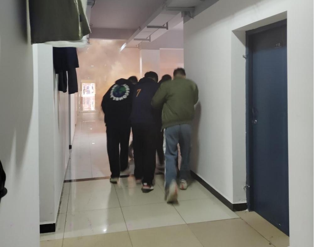 下午16:00,工作人員在11號宿舍樓各要道口點(diǎn)燃煙霧彈,拉響警鈴聲,消防安全疏散演練正式開始。演練過程中,輔導(dǎo)員、志愿者們本著“安全第一”的原則,組織學(xué)生快速、有序疏散。學(xué)生們聽指揮、不驚慌、無推擠、無沖撞,捂住口鼻、低頭彎腰、安全逃生。