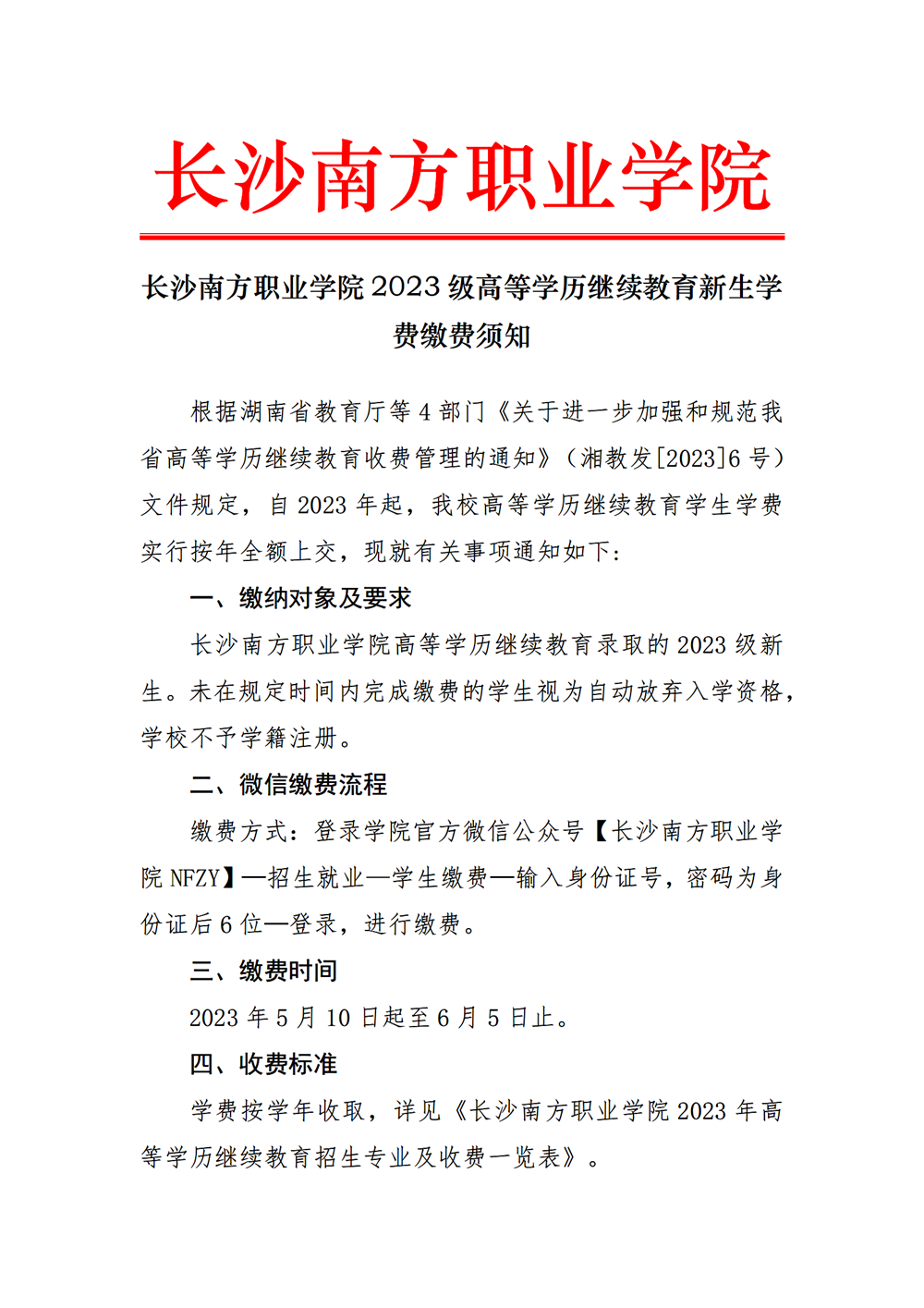 長沙南方職業(yè)學院2023級高等學歷繼續(xù)教育新生學費繳費須知