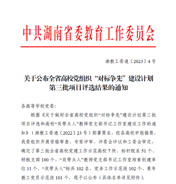 近日,湖南省高校黨組織“對標爭先”計劃第三批項目評選結果公布。我校民航學院黨總支入選全省高校黨建“標桿院系”、經(jīng)濟貿(mào)易系學生黨支部入選全省高校黨建“樣板支部”、黨委辦公室副主任嚴曉蕾入選全省高校“黨務工作示范崗”。