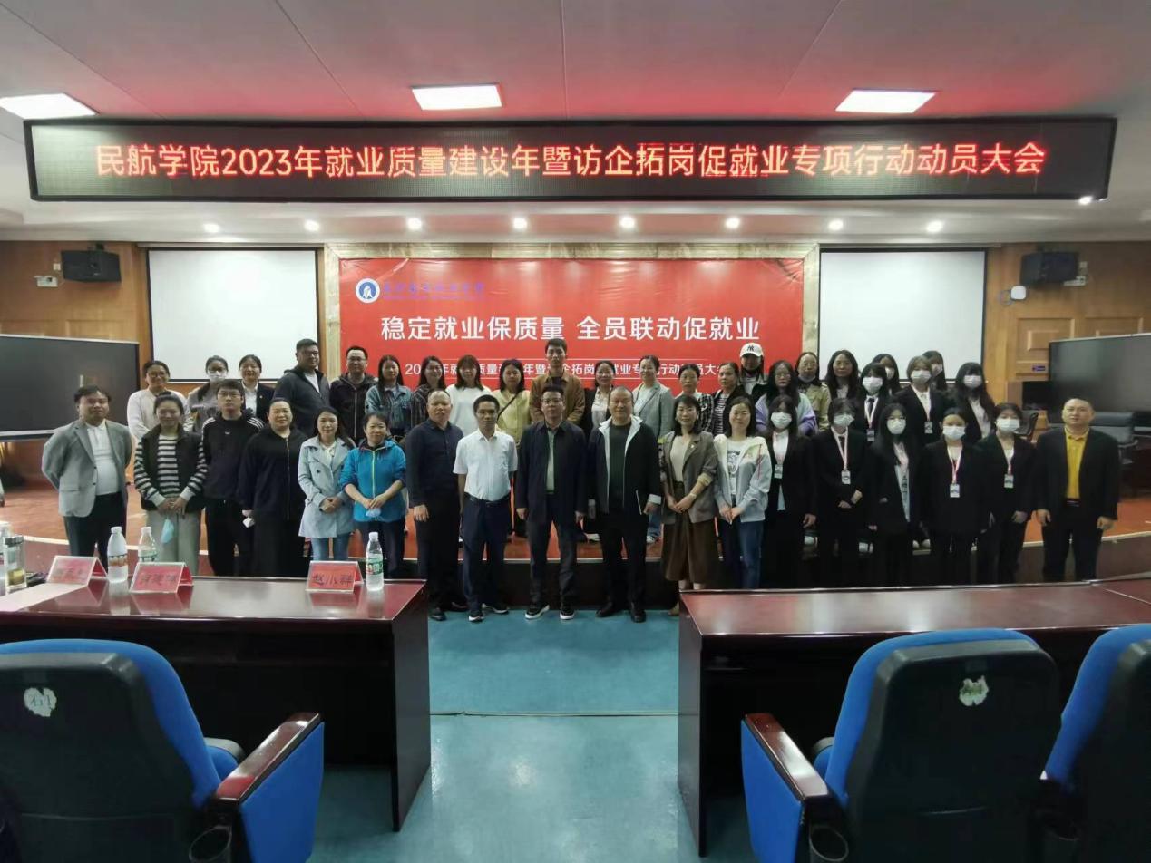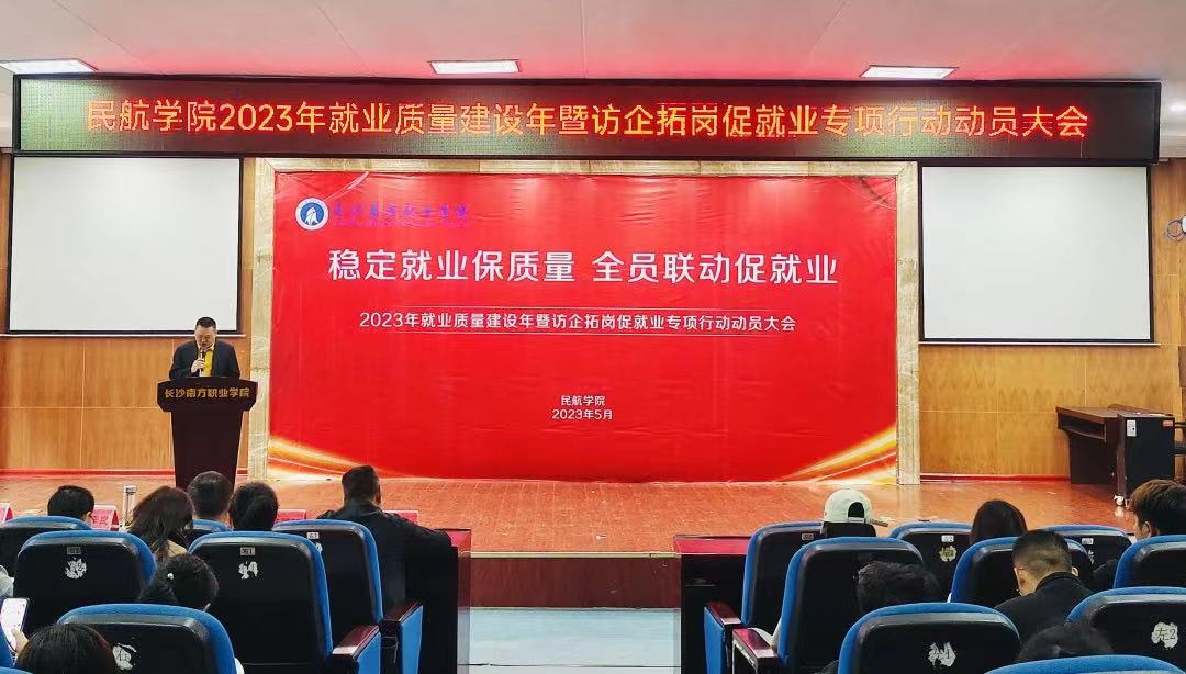 近日,民航學院召開2023年就業(yè)質量建設年暨訪企拓崗促就業(yè)專項行動動員大會。政府督導、校黨委書記趙小群、副校長肖建偉、招生就業(yè)處處長曹永彪、副處長譚澤良蒞臨指導,民航學院全體教職工和學生代表參加會議。