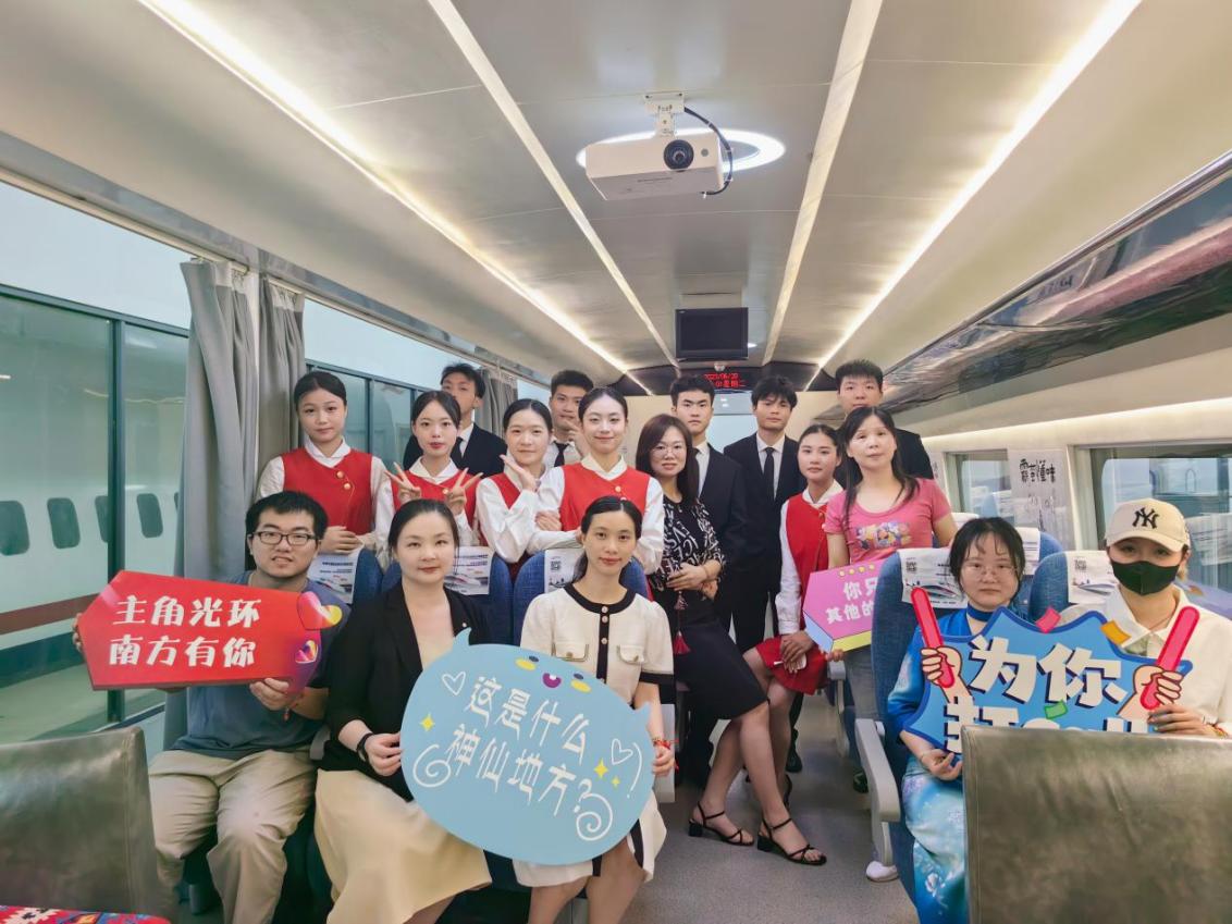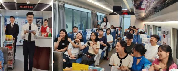 座無虛席的車廂內(nèi),乘務(wù)員帶領(lǐng)全體“旅客”齊誦《沁園春?長沙》,共同緬懷一代偉人毛澤東。湖湘文化知識搶答賽更是將“旅客們”的現(xiàn)場氣氛帶入新的高潮。“三湘四水”指什么?湖南最后通高鐵的城市是哪個?“屈賈之鄉(xiāng)”“朱張會講”是指誰?我國第一個國家森林公園是哪個……《空鐵旅游地理》課程上的知識點既是一種特別形式的課程復(fù)習(xí),也讓學(xué)生進(jìn)一步將湖湘文化內(nèi)化于心。