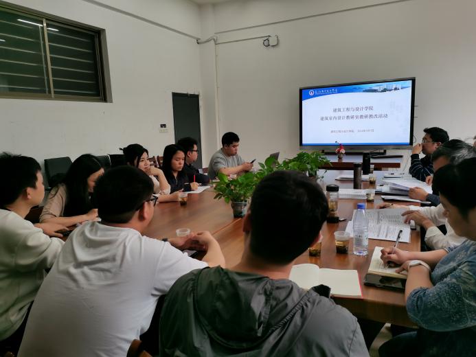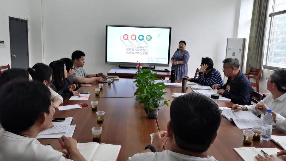 曾文妮介紹室內(nèi)教研室教研教改情況。室內(nèi)教研室主任曾文妮副教授從建筑室內(nèi)設(shè)計專業(yè)(以下簡稱“室內(nèi)專業(yè)”)專業(yè)概況、黨建引領(lǐng)、教學(xué)改革、教研成果四個方面,對室內(nèi)專業(yè)“黨建+”的教研教改成果進(jìn)行匯報,并針對室內(nèi)專業(yè)在快速發(fā)展過程中出現(xiàn)的一些問題進(jìn)行說明,表示全體教師將立行立改,以打造“金課”的態(tài)度上好每一堂課!