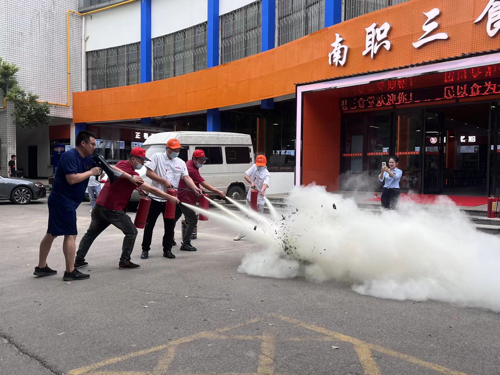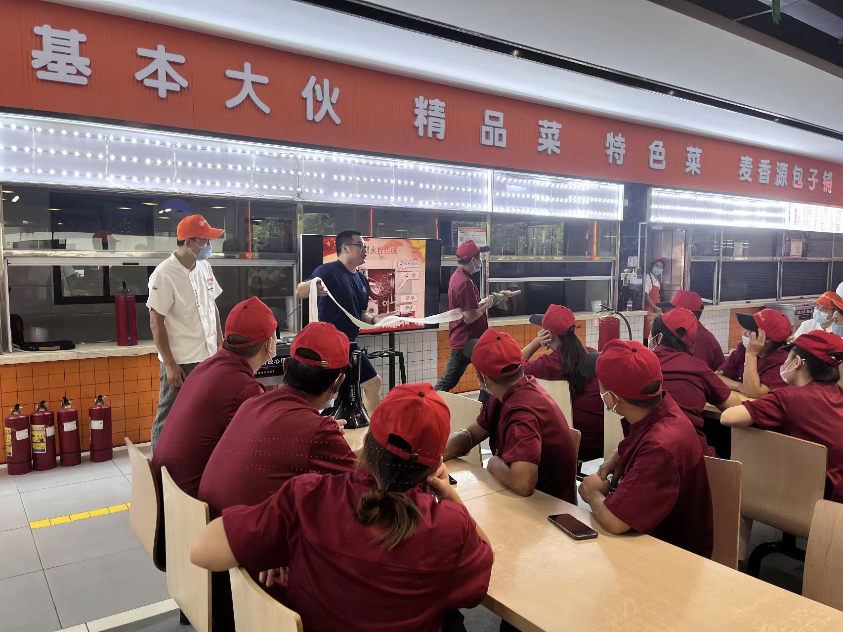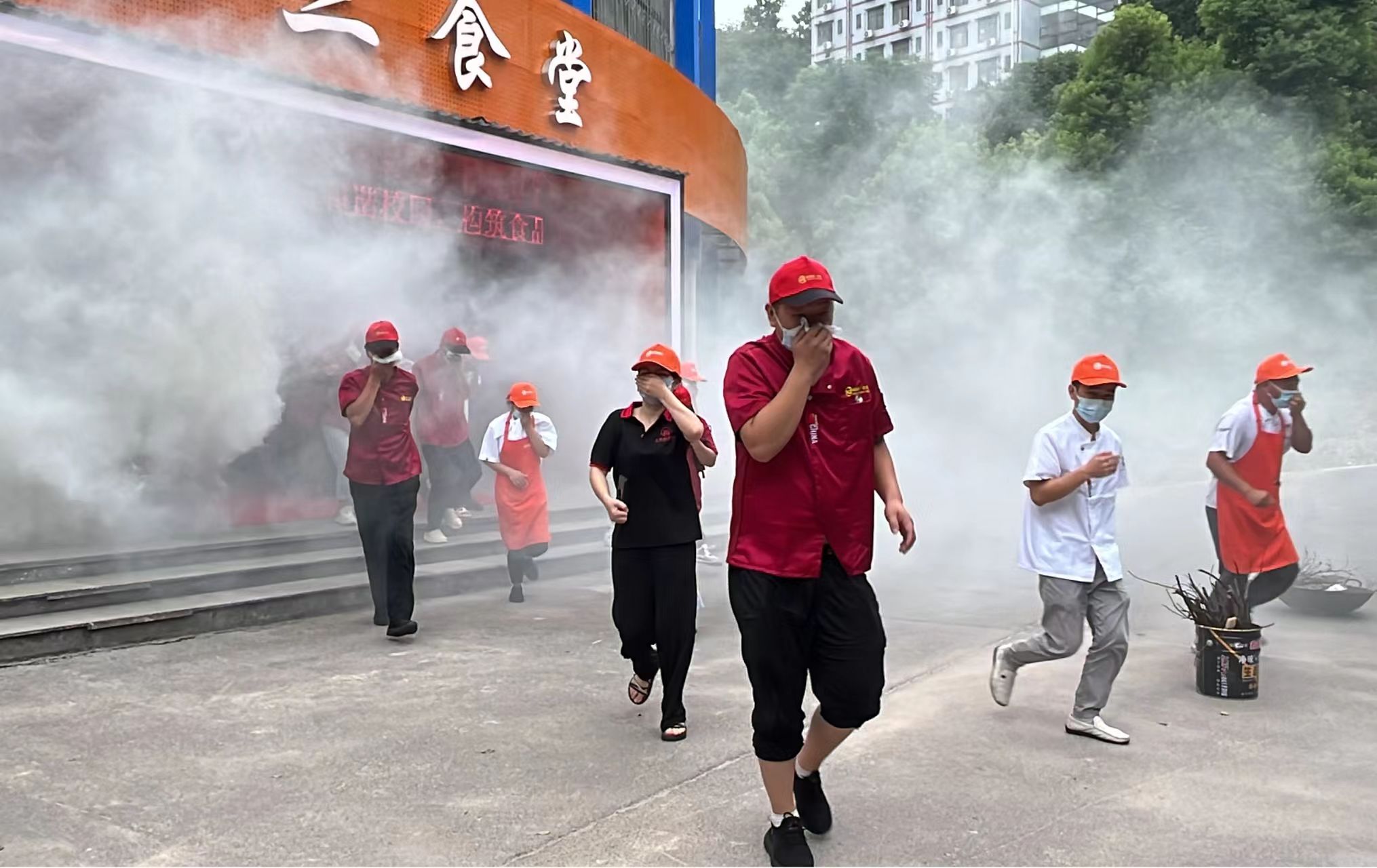 模擬演練場景設(shè)定為食堂廚房區(qū)域因油鍋起火引發(fā)火災(zāi),食堂工作人員根據(jù)緊急疏散信號,按照指定的疏散路線快速、有序地撤離至安全區(qū)域。