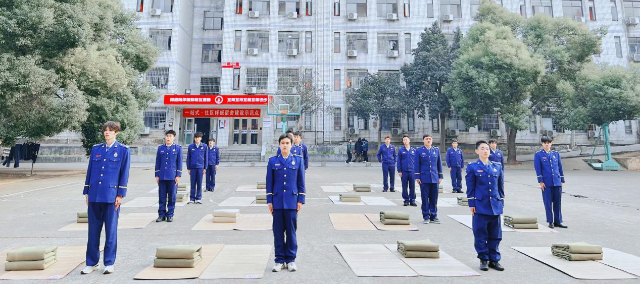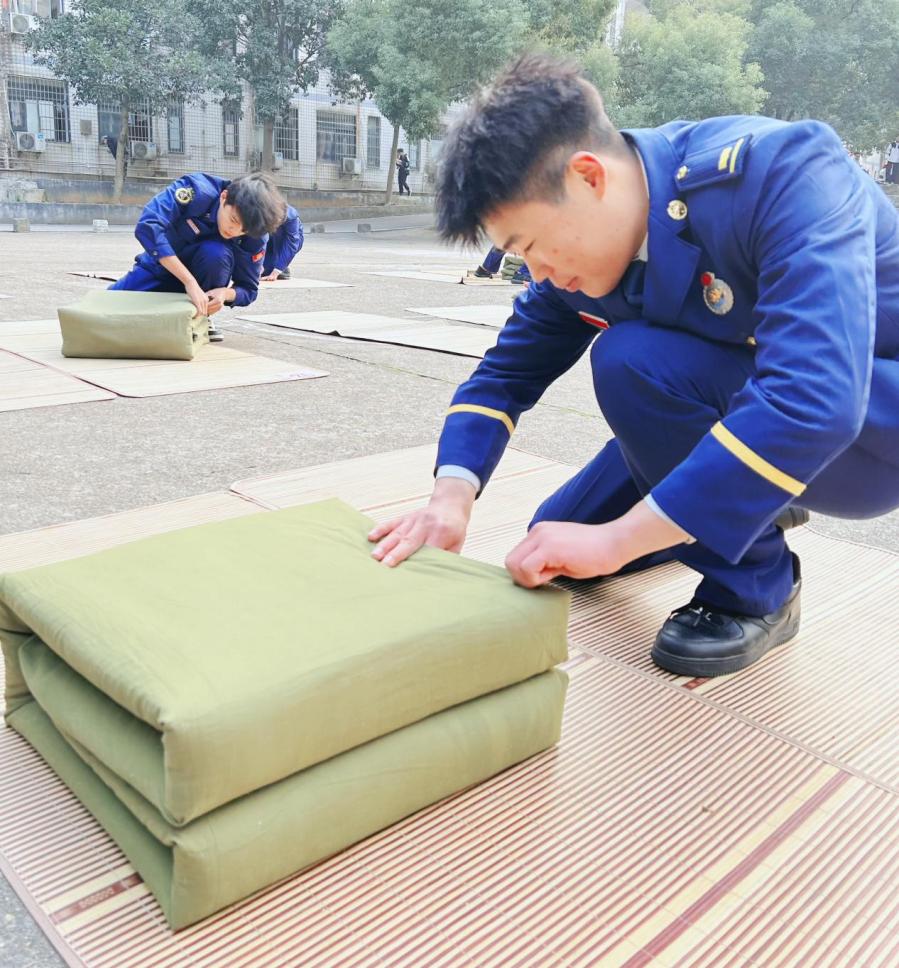 參觀考察結(jié)束后,消防專(zhuān)業(yè)內(nèi)務(wù)比武活動(dòng)在學(xué)校本部11棟前籃球場(chǎng)進(jìn)行。比賽規(guī)則為在規(guī)定時(shí)間內(nèi),運(yùn)用“疊、壓、折、擠、捋、修”等操作技能,完成“棉被”到“豆腐塊”的華麗轉(zhuǎn)變。