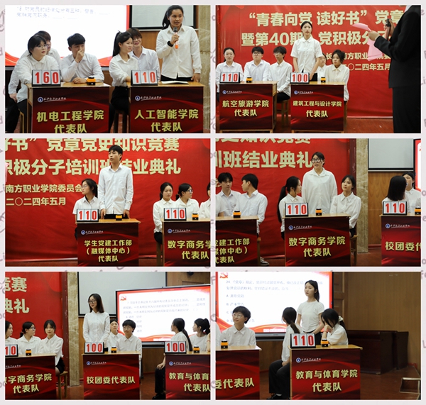 競(jìng)賽現(xiàn)場(chǎng)本次競(jìng)賽經(jīng)各黨總支初賽,評(píng)選出來(lái)自各學(xué)院、校團(tuán)委及學(xué)生黨建工作部(融媒體中心)8支參賽隊(duì)。采用必答題、搶答題、風(fēng)險(xiǎn)題方式經(jīng)三輪比拼,機(jī)電工程學(xué)院獲一等獎(jiǎng),航空旅游學(xué)院、人工智能學(xué)院、數(shù)字商務(wù)學(xué)院、學(xué)生黨建工作部(融媒體中心)獲二等獎(jiǎng),教育與體育學(xué)院、建筑工程與設(shè)計(jì)學(xué)院、校團(tuán)委獲三等獎(jiǎng)。現(xiàn)場(chǎng),對(duì)知識(shí)競(jìng)賽獲獎(jiǎng)代表隊(duì)及黨訓(xùn)班優(yōu)秀學(xué)員、優(yōu)秀組長(zhǎng)進(jìn)行了集體表彰。