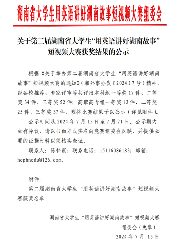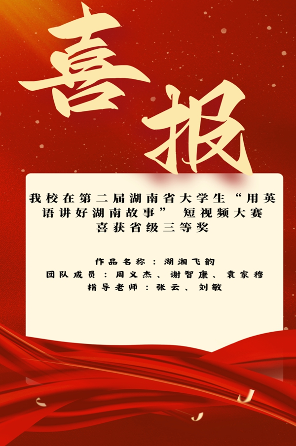7月15日,第二屆湖南省大學(xué)生“用英語講好湖南故事”短視頻大賽獲獎(jiǎng)結(jié)果公布,長沙南方職業(yè)學(xué)院推薦作品《湖湘飛韻》獲三等獎(jiǎng)。