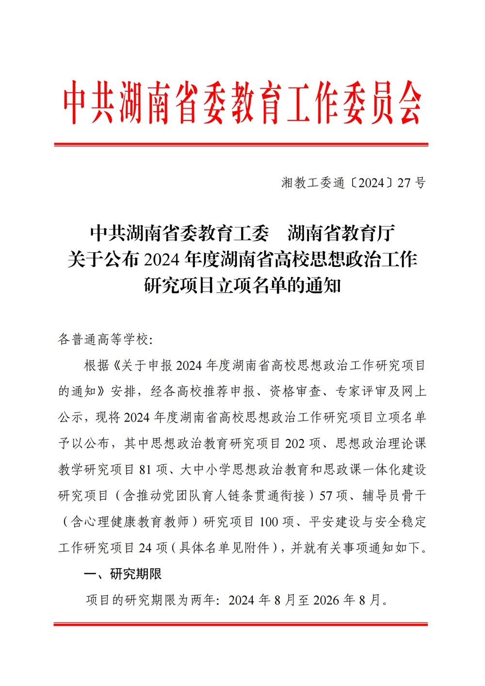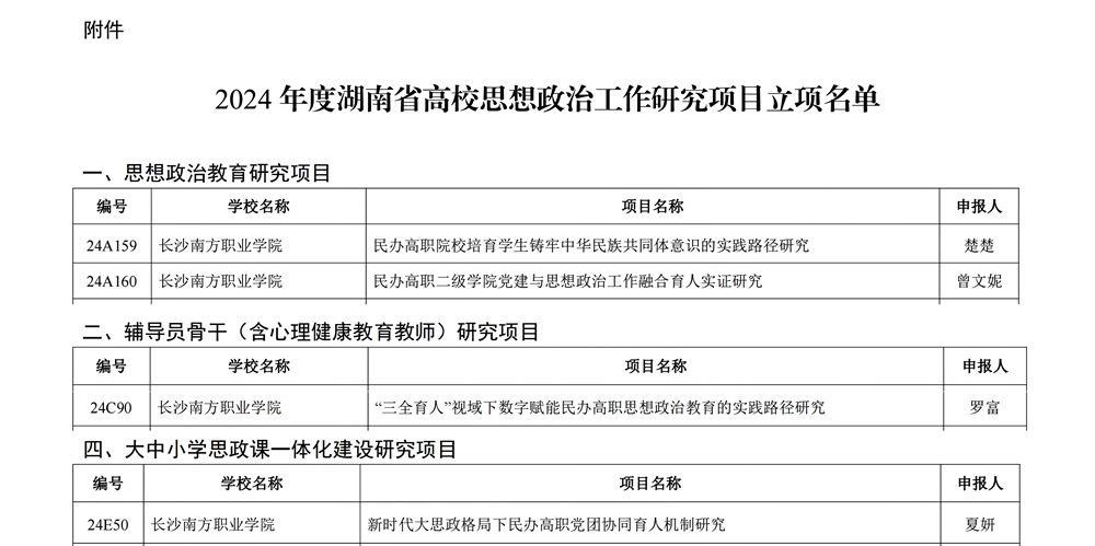 近日,中共湖南省委教育工委、湖南省教育廳《關(guān)于公布2024年度湖南省高校思想政治工作研究項目立項名單的通知》(湘教工委通[2024]27號)顯示,長沙南方職業(yè)學(xué)院成功立項思想政治教育研究項目2項、輔導(dǎo)員骨干(含心理健康教育教師)研究項目1項、大中小學(xué)思政課一體化建設(shè)研究項目1項。