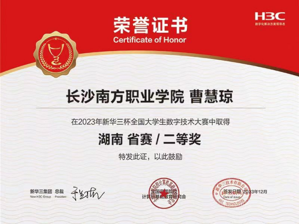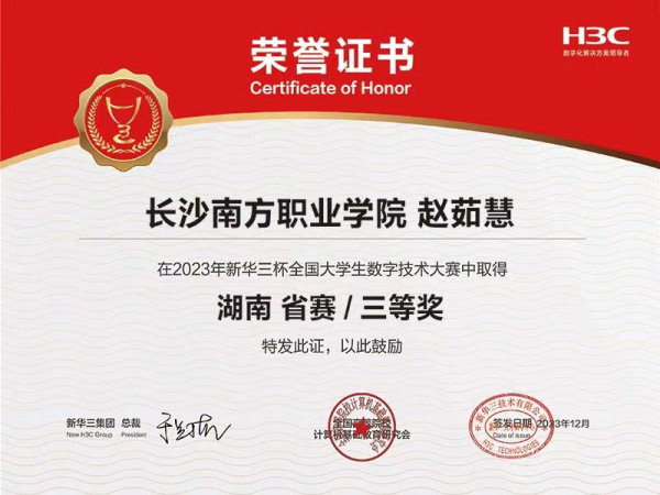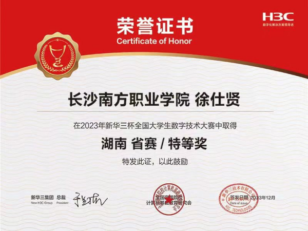 近日,第13屆“新華三杯”全國大學生數(shù)字技術大賽湖南省復賽成績揭曉。在人工智能學院張德平、余小麗等專業(yè)教師的指導下,2022級計算機網(wǎng)絡技術專業(yè)共有50名學生參賽,最終獲得特等獎2項、二等獎3項、三等獎3項的好成績。我校2022級學生徐仕賢、申慶偉獲得省賽特等獎,晉級全國決賽。