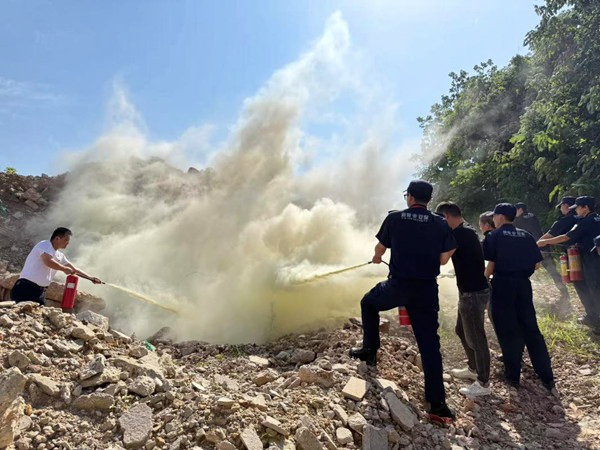 講座后,保衛(wèi)處組織教職工模擬火源場景進行消防滅火實踐演練。參演教職工嚴格按照操作規(guī)程,提起滅火器、拔掉保險銷,對準火焰根部左右噴射,迅速撲滅“明火”,整個過程緊張有序,達到預期演練效果。