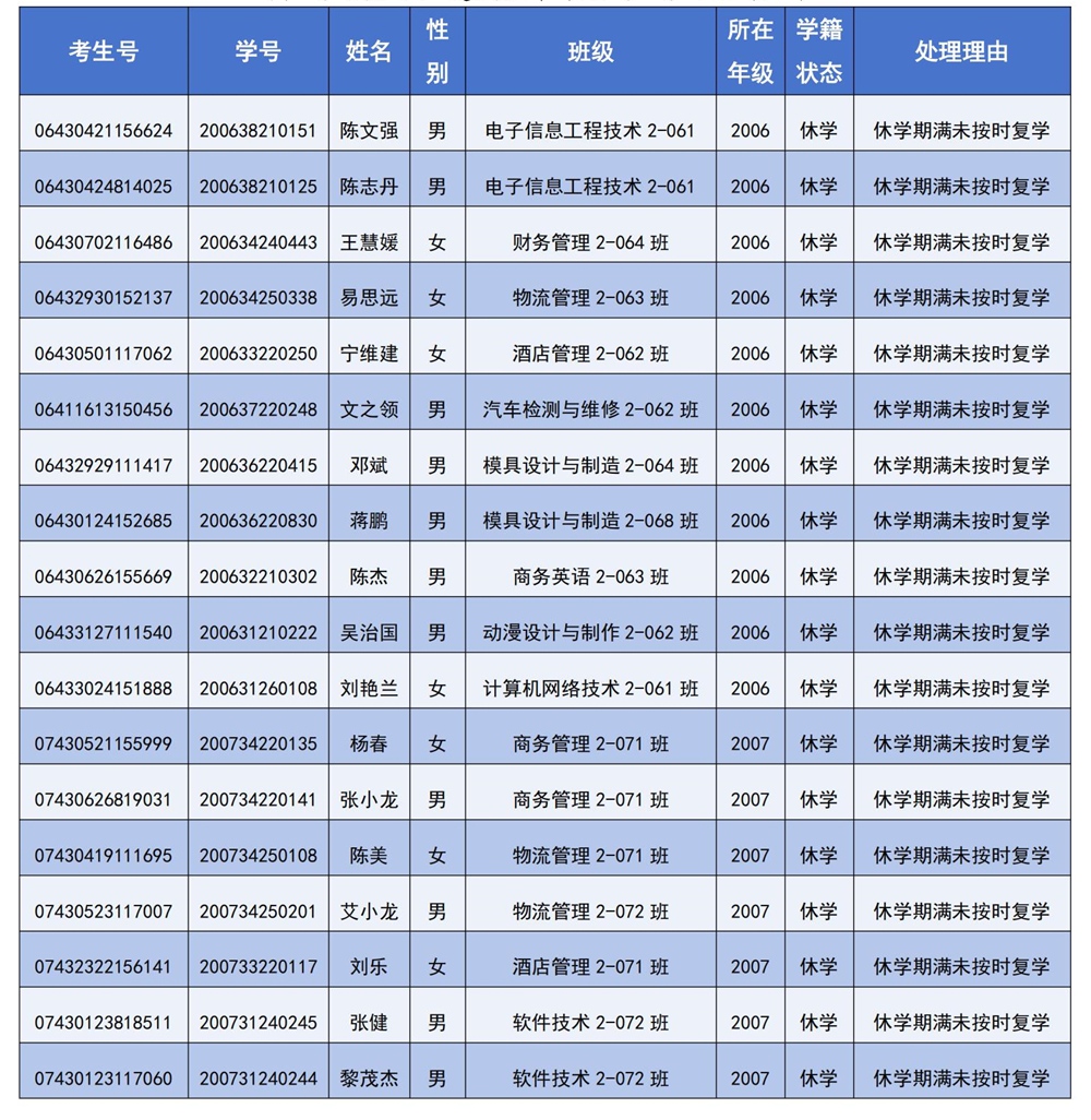 經(jīng)審查,發(fā)現(xiàn)陳文強(qiáng)等 57 名學(xué)生(具體名單見附件)休學(xué)期滿后,未在規(guī)定時(shí)間內(nèi)向?qū)W校提交復(fù)學(xué)材料,且根據(jù)其學(xué)業(yè)進(jìn)度及剩余時(shí)間評估,無法在學(xué)校規(guī)定的修業(yè)年限內(nèi)完成學(xué)業(yè)?,F(xiàn)依據(jù)《長沙南方職業(yè)學(xué)院學(xué)生管理規(guī)定》第三十二條、第三十六條之規(guī)定。經(jīng)學(xué)校研究,決定對陳文強(qiáng)等 57 名休學(xué)期滿逾期未復(fù)學(xué)學(xué)生作出退學(xué)處理。