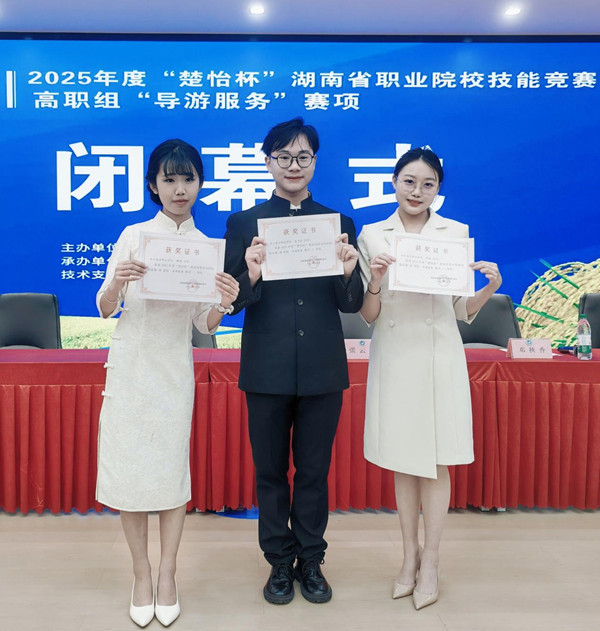 近日,2025年度“楚怡杯”湖南省職業(yè)院校技能競賽高職組“導游服務”賽項在懷化職院圓滿落幕。經(jīng)過激烈角逐,航空旅游學院三名學生(旅游管理專業(yè)2-2303班羅瑤、鮮瑞和高速鐵路客運服務專業(yè)2-2303班吳寧波)憑借扎實的專業(yè)功底、出色的臨場表現(xiàn)和良好的職業(yè)素養(yǎng),均榮獲三等獎。